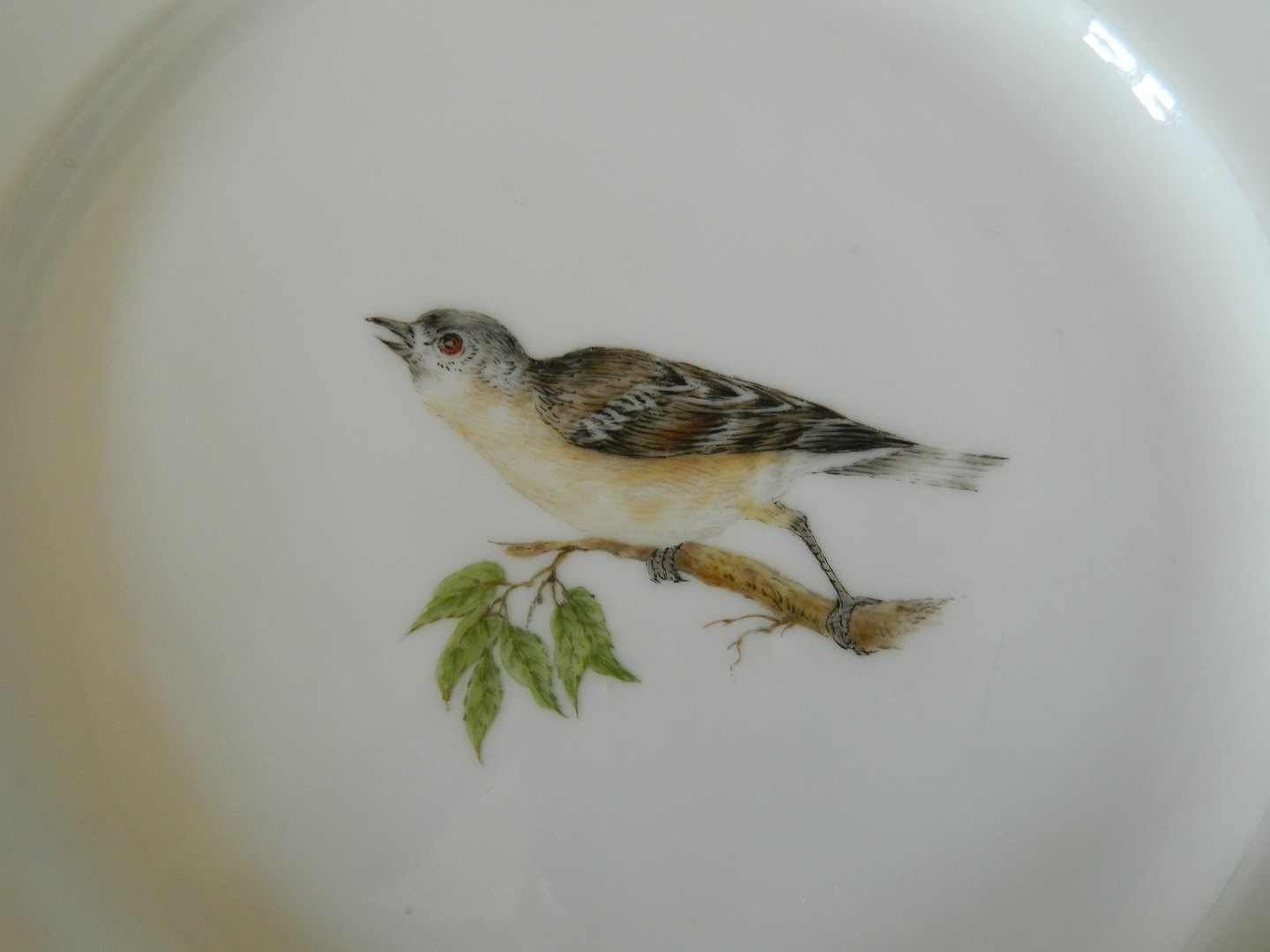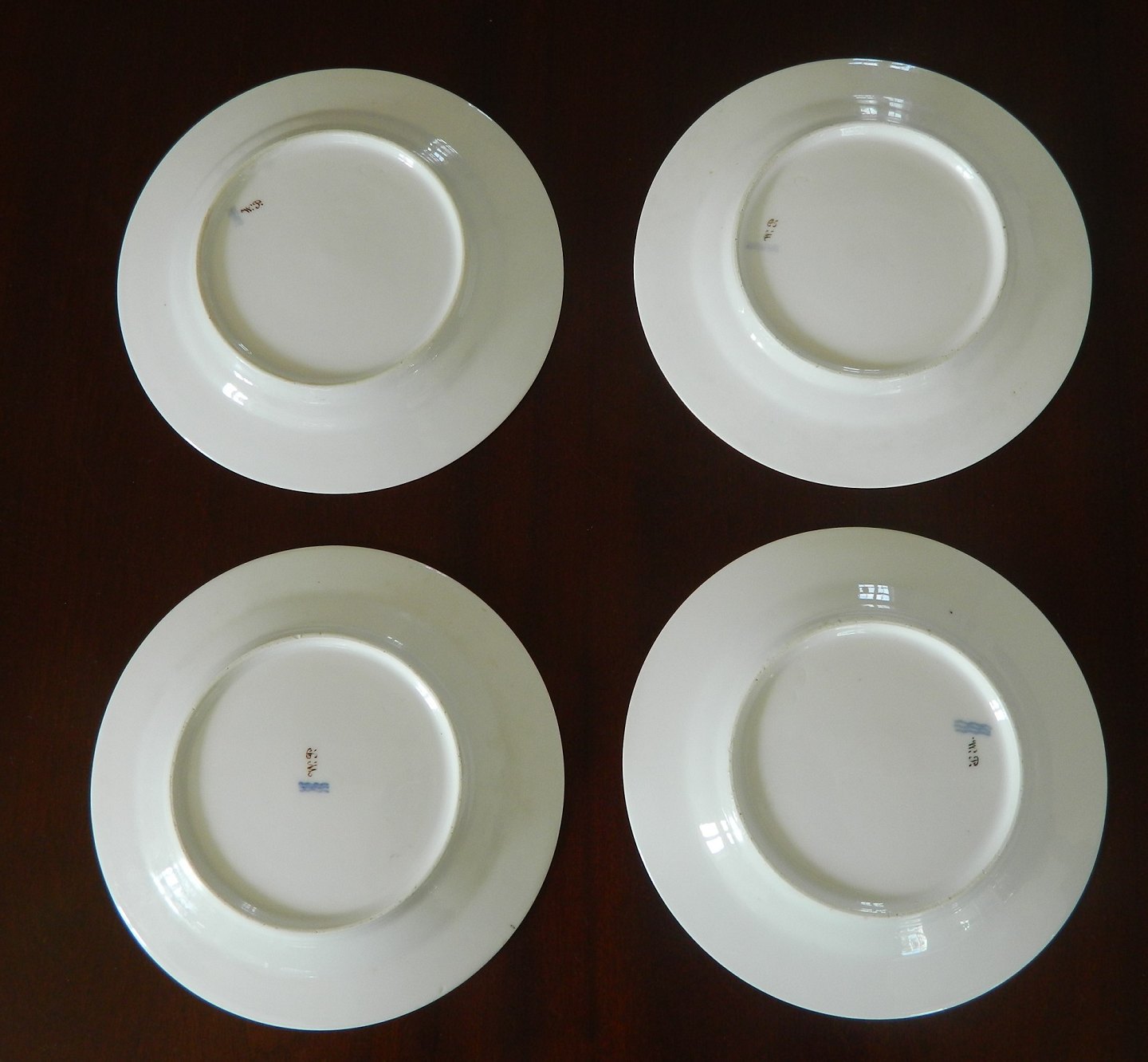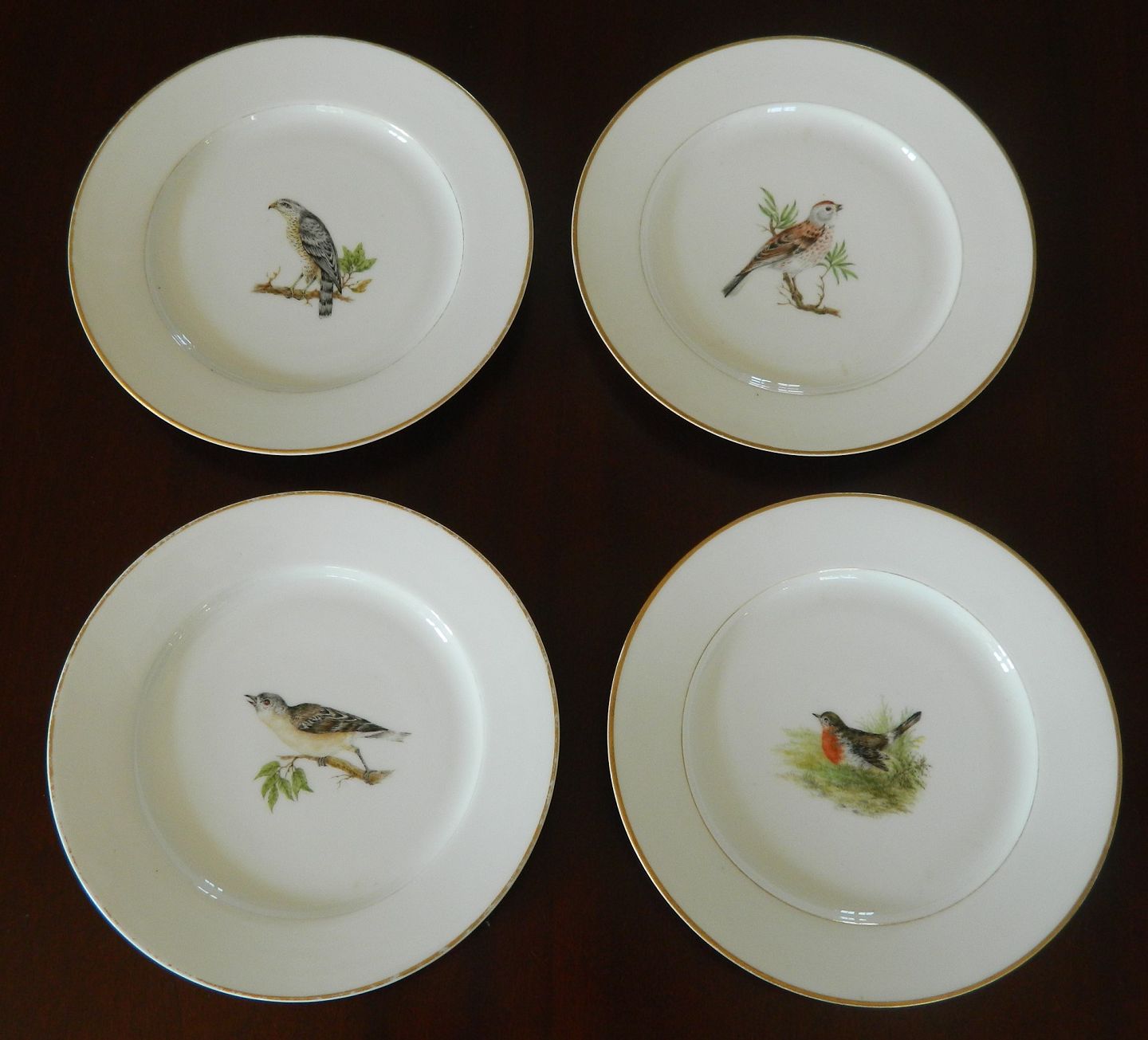 Fire tallerkener i porcelæn fra Royal Copenhagen omkring midten af 19. århundrede. Alle fire dekorerede med fuglemotiver. I god stand uden skader eller reparationer. Lidt brugsslid på guldet på kanten af tallerkenerne. Alle fabriksmærkede sammen med kunstnerens monogram - ubekendt kunstner ! Mål: 18½ cm i diameter
