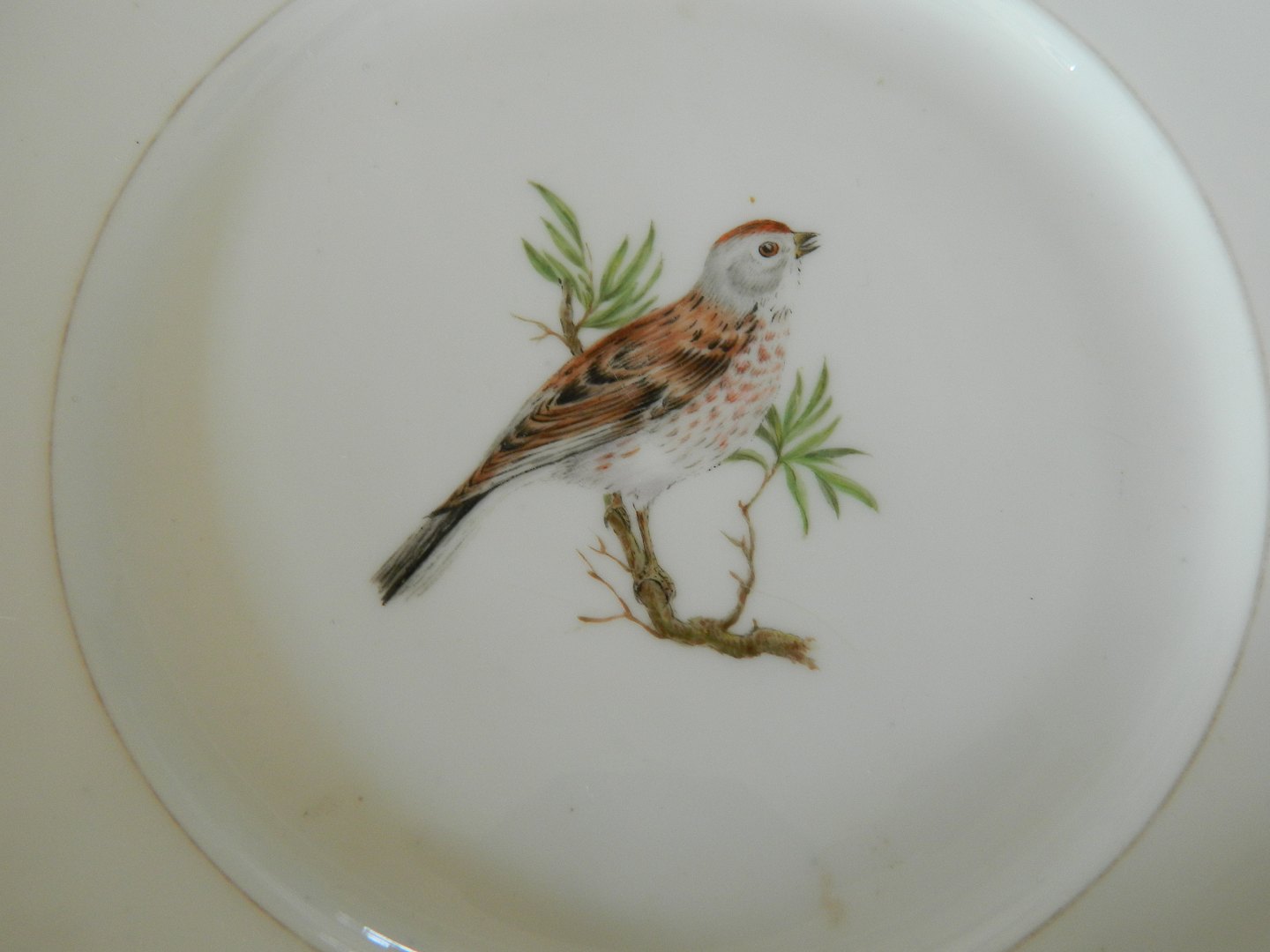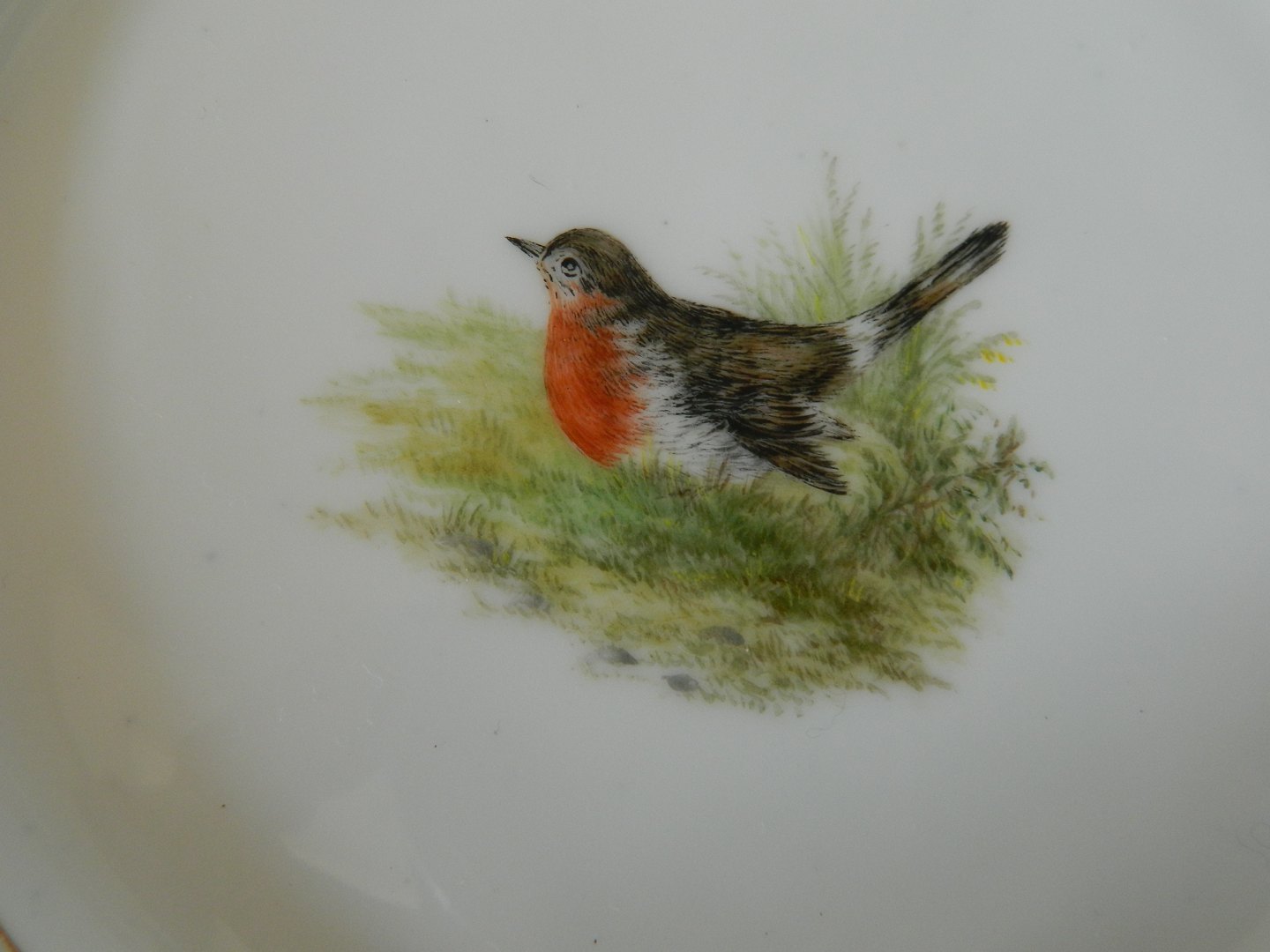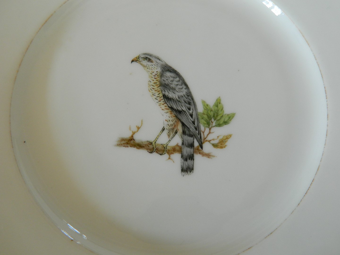 Fire tallerkener i porcelæn fra Royal Copenhagen omkring midten af 19. århundrede. Alle fire dekorerede med fuglemotiver. I god stand uden skader eller reparationer. Lidt brugsslid på guldet på kanten af tallerkenerne. Alle fabriksmærkede sammen med kunstnerens monogram - ubekendt kunstner ! Mål: 18½ cm i diameter