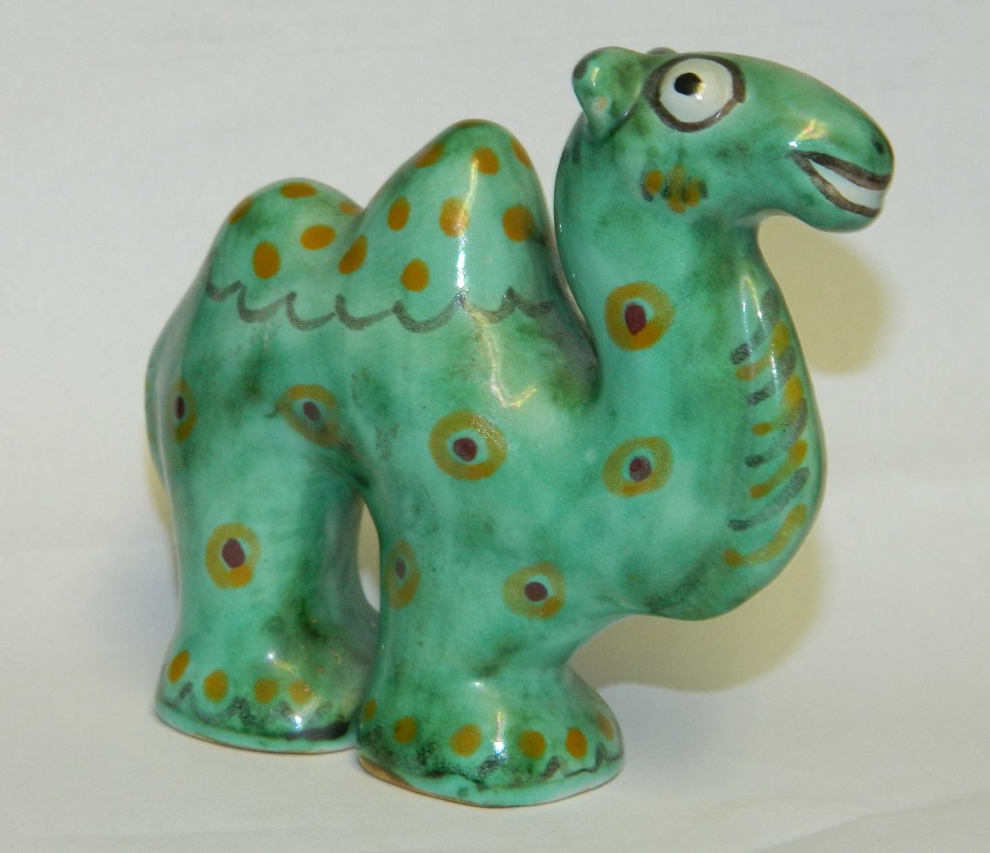 Charmerende grønmalet figur med prikker af smilende kamel med store øjne. Fremstillet hos L. Hjorth på Bornholm. I perfekt stand. Fabriksmærket på bunden. Mål: H. 8 cm L. 8 cm.