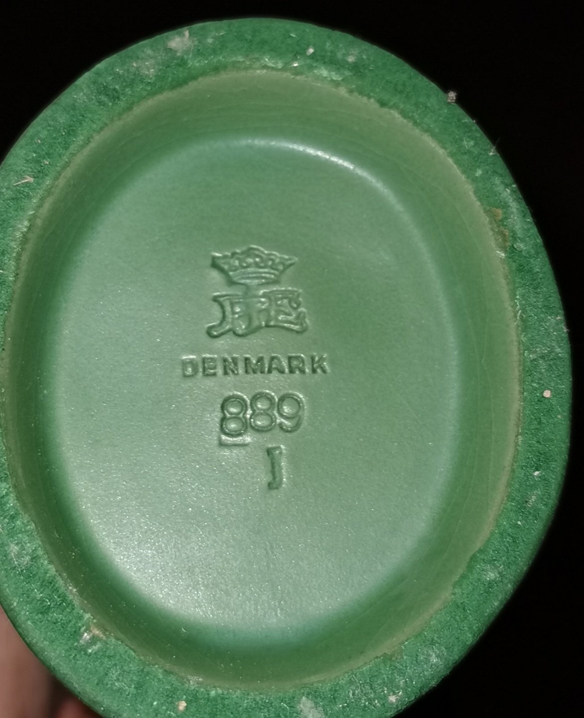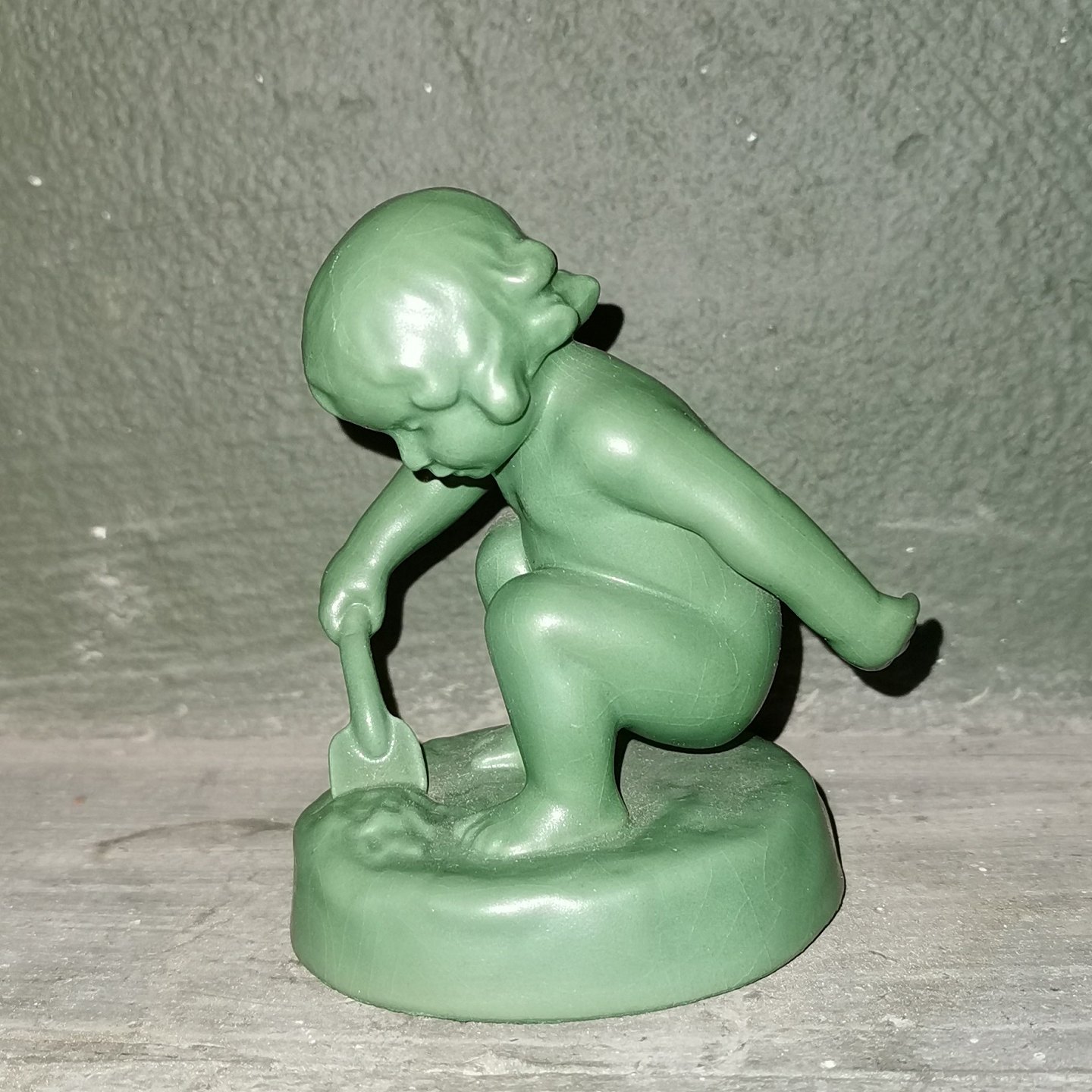 Figur i keramik af pige med skovl, Ipsens Enke. Model Nr. 889. Dækket af grøn glasur. Modelnummer og fabriksstempel på bunden. H. 11 cm.