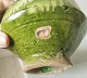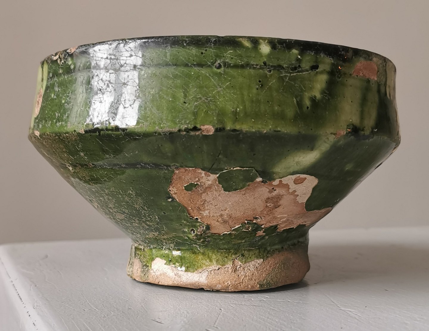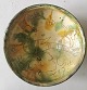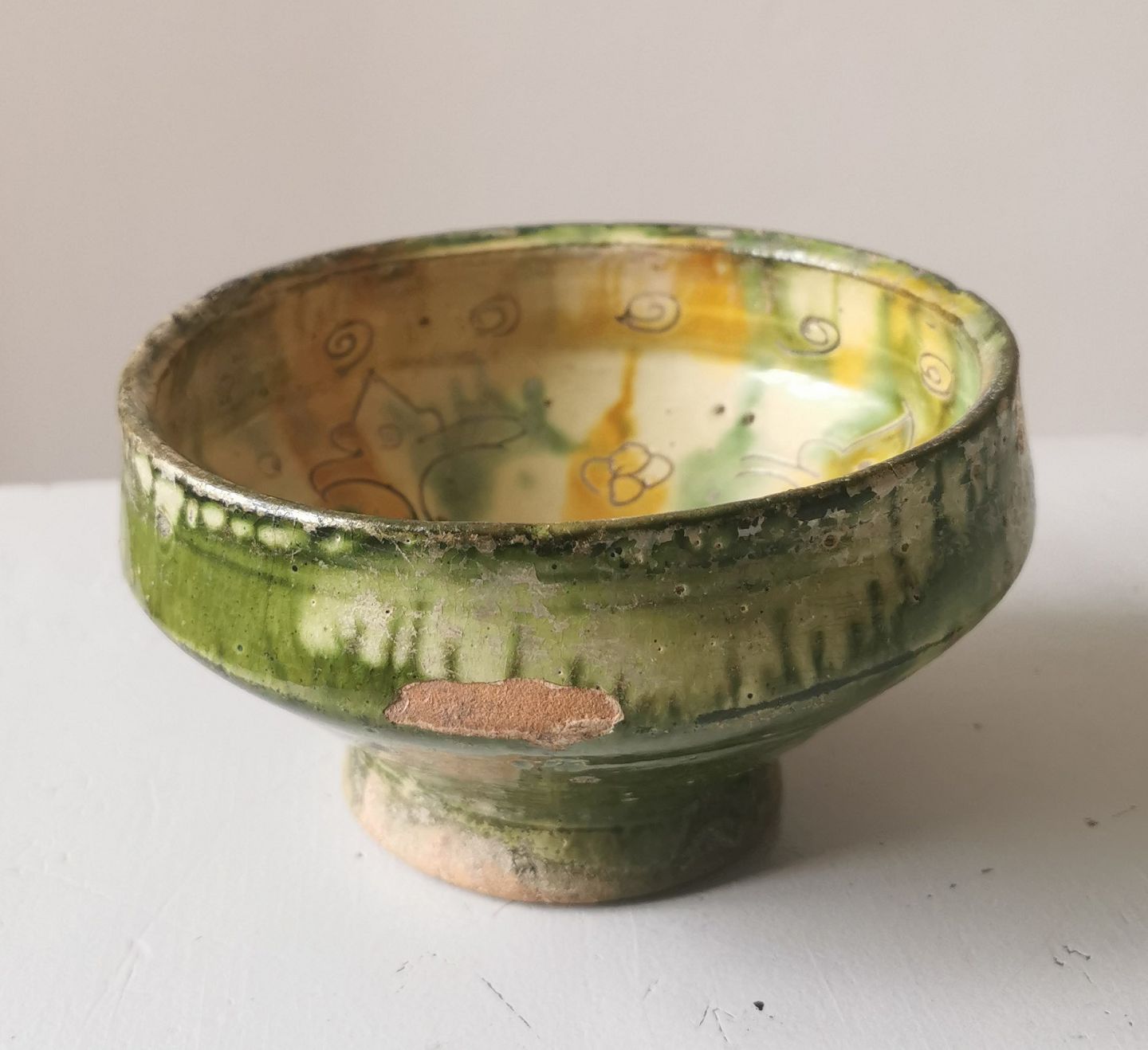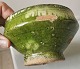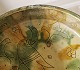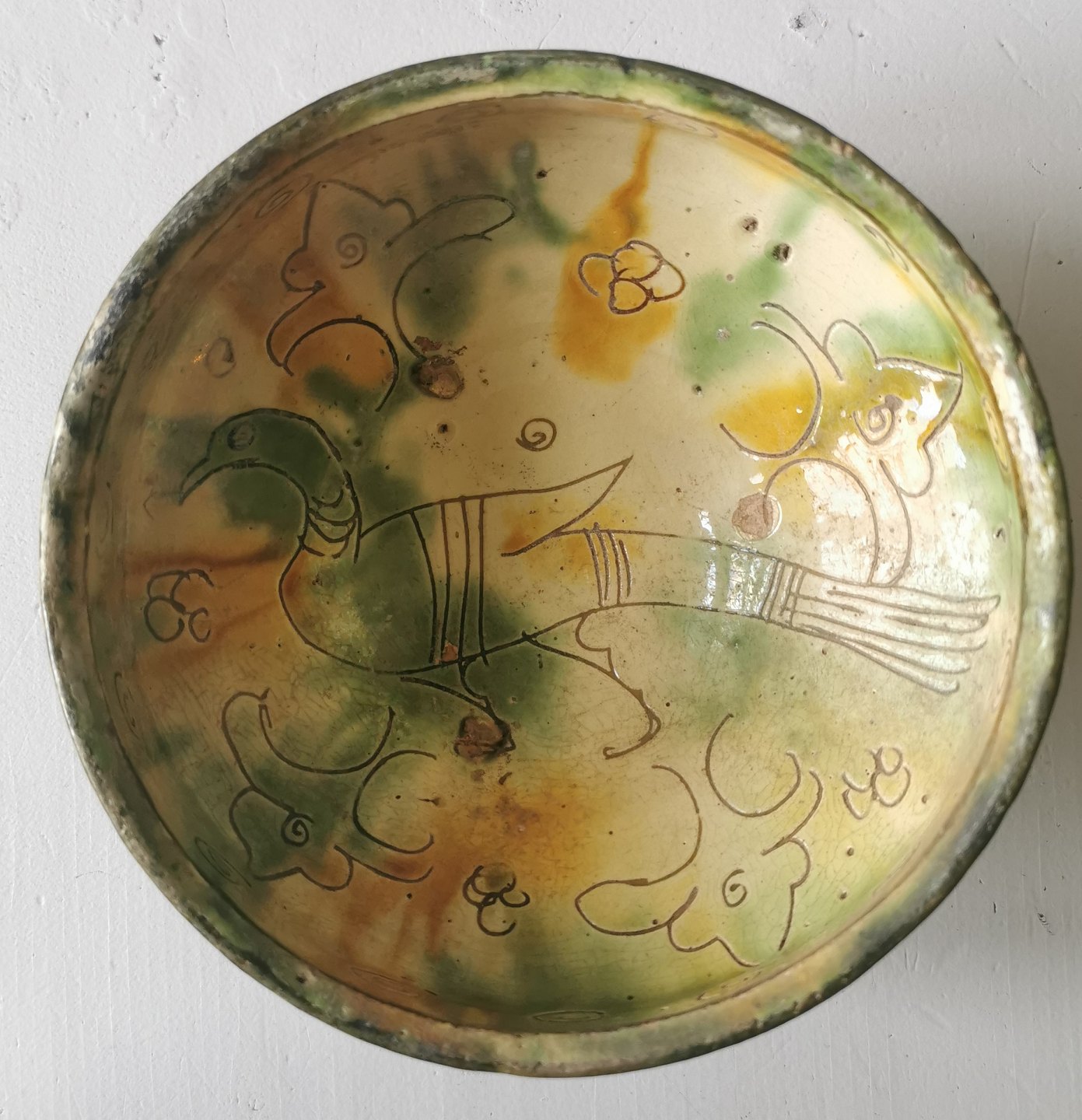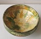 Charmerende skål i lertøj med indridset dekoration af fugl i bunden af skålen. Tillige glaseret. Delvist afskalninger af glasuren som billederne viser. Endvidere "slag" eller skår på siden. Formoder den i hvertfald er fremstillet i 19. århundrede måske endda noget tidligere. H. 9½ cm top diameter på 15 cm