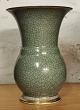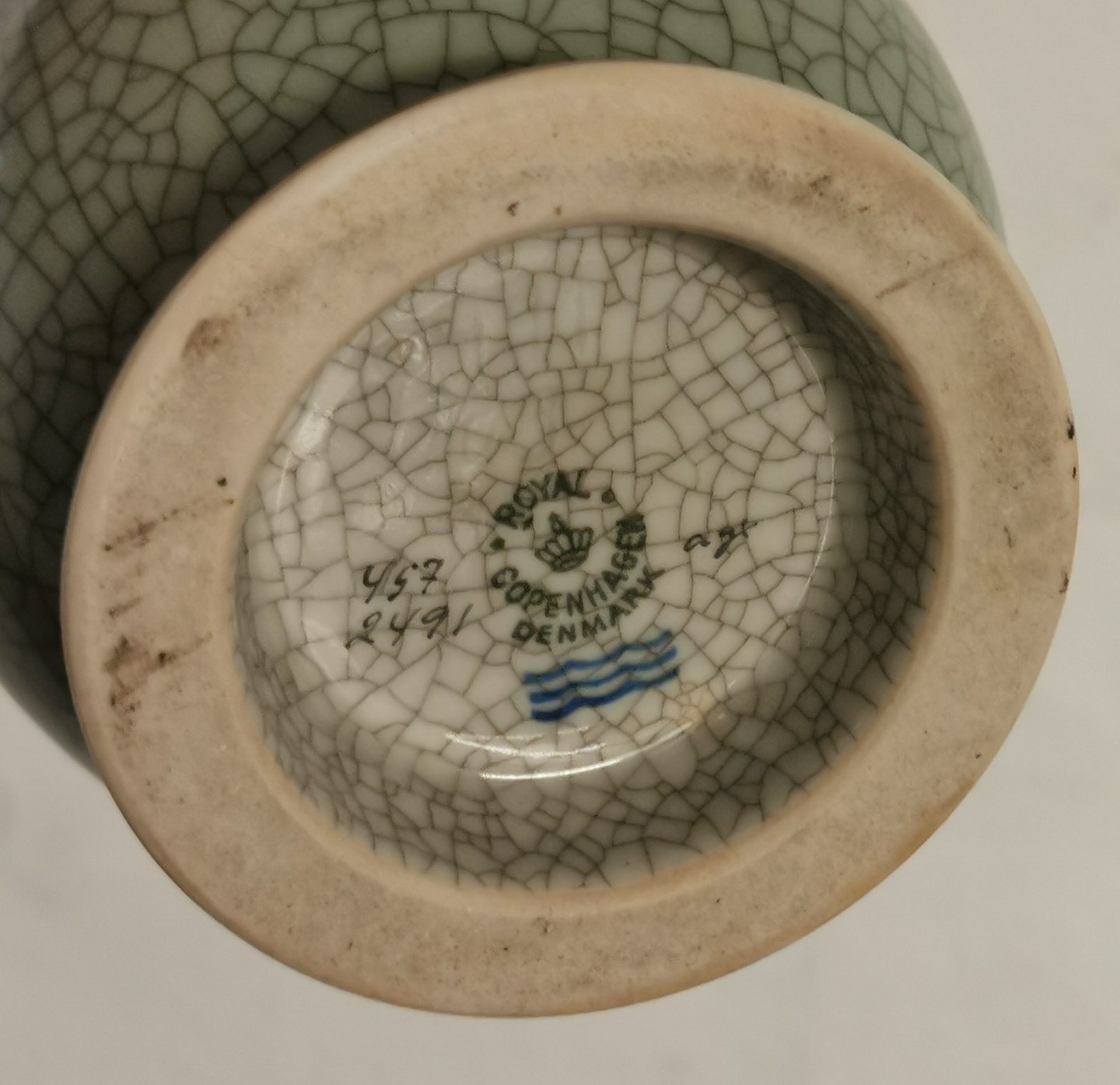 Porcelain vase from Royal Copenhagen with trumpet shaped opening. Covered in green crackled glaze. Appears in good condition without damage or repairs. The factory mark on the bottom. Model number 457/2491. H. 17 cm. The diameter of the opening is 12 cm.