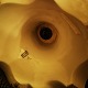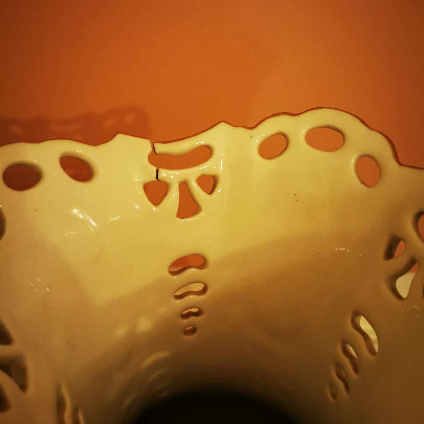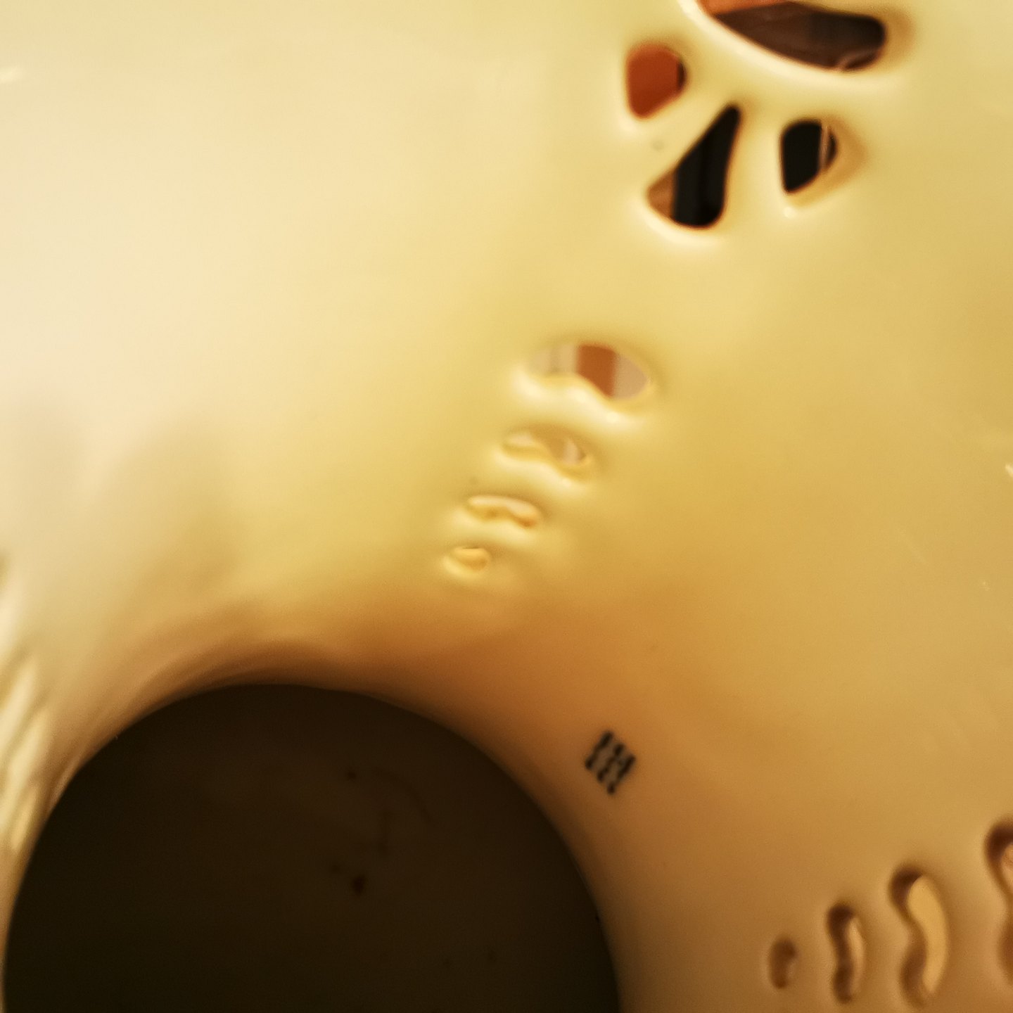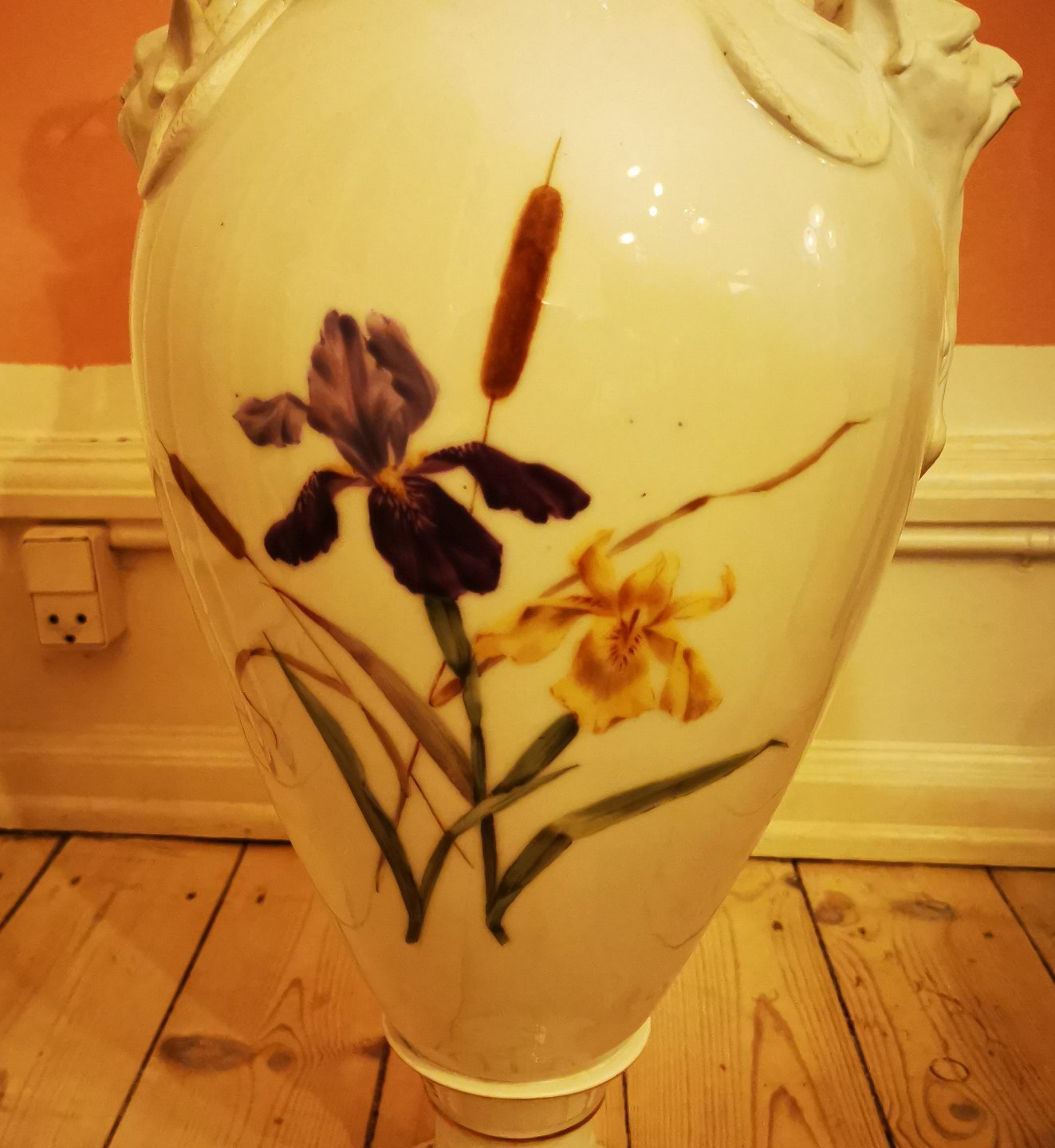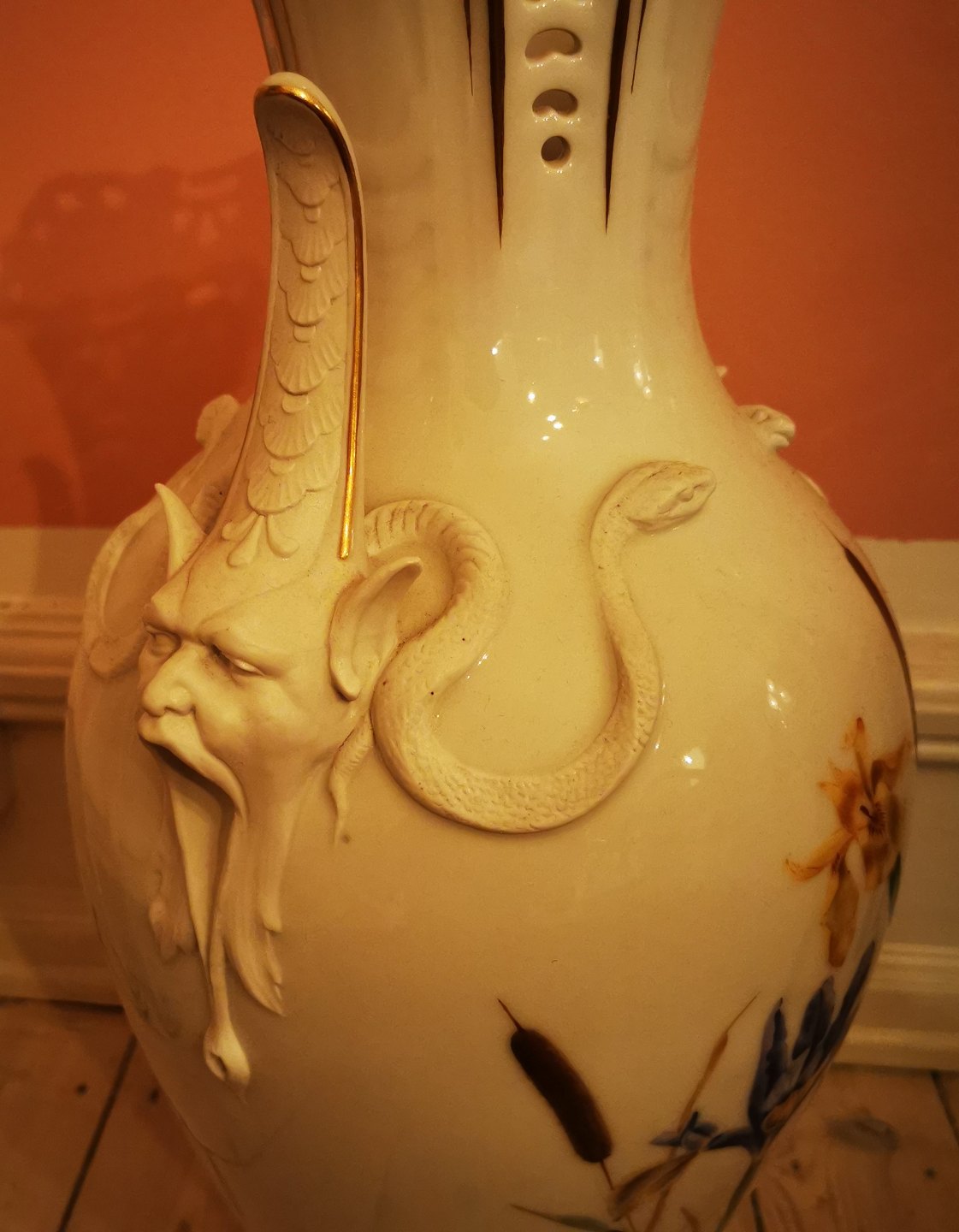 Stor gulvvase i porcelæn fra Royal Copenhagen. Dekoreret med bemalede blomster på to sider. Gennembrudt dekoration øverst. Tillige dekoreret med satyr ansigt med åben mund samt slanger i bisquit. På kanten ses produktionsfejl. Ud over denne fejl ingen defekter eller reparationer. Fabriksmærket indvendigt nedad halsens åbning samt opp under bunden. H. 66 cm