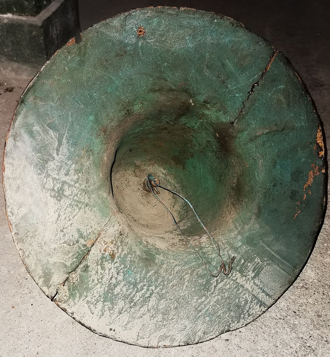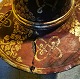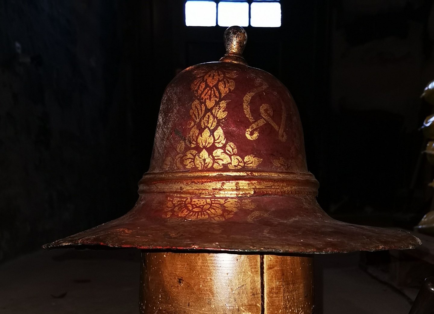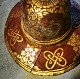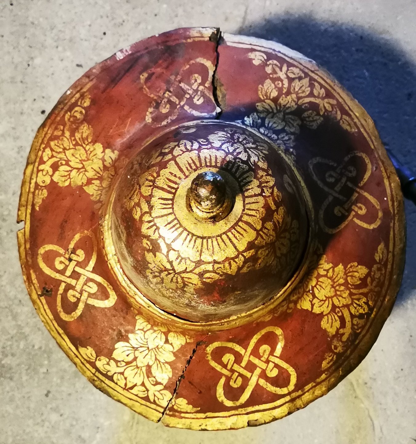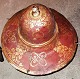 Hat til ceremoniel formål fra Tibet. Formodes fremstillet i 19. århundrede. Meget let. Materialet syntes at være som papmaché. Rød med gulddekorationer med symboler og bladværk. Fremstår med revner, hvilket sikkert skydes at den har ligget et sted med skiftende temperaturer.