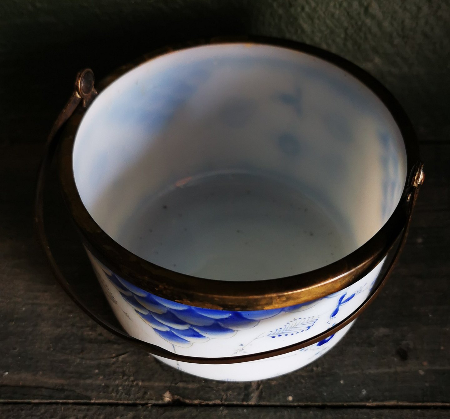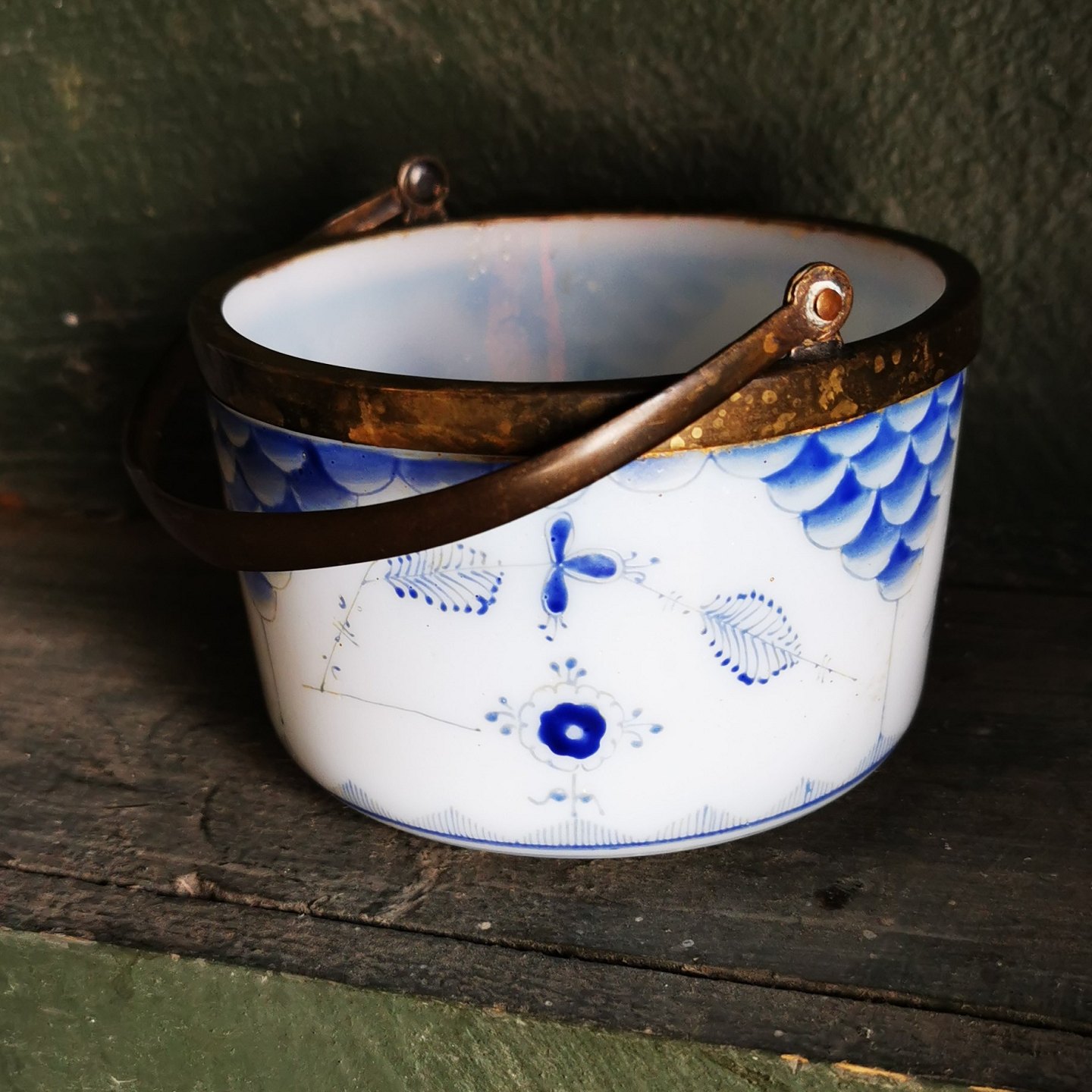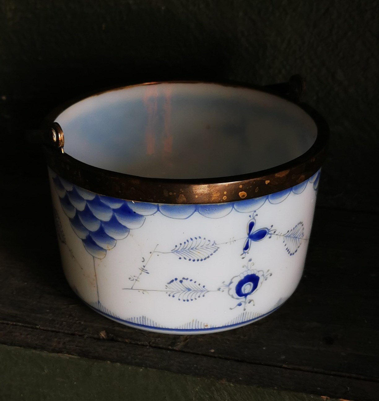 Skål i opalineglas med blå musselmalet decoration. Metal montering med hank. I god stand. Fremstillet omkring 1910. Mål: H. 7 cm Ø. 11 cm.