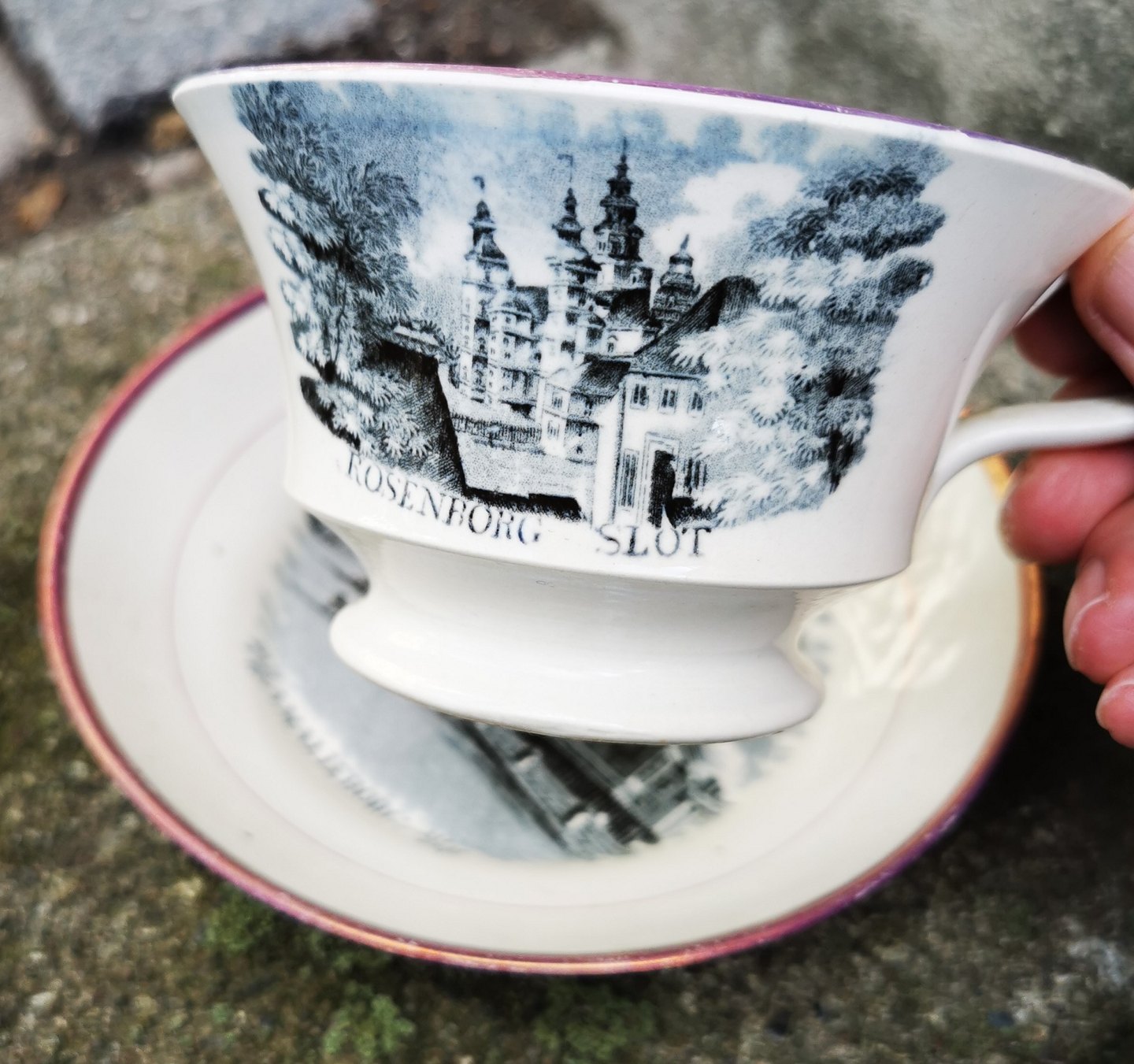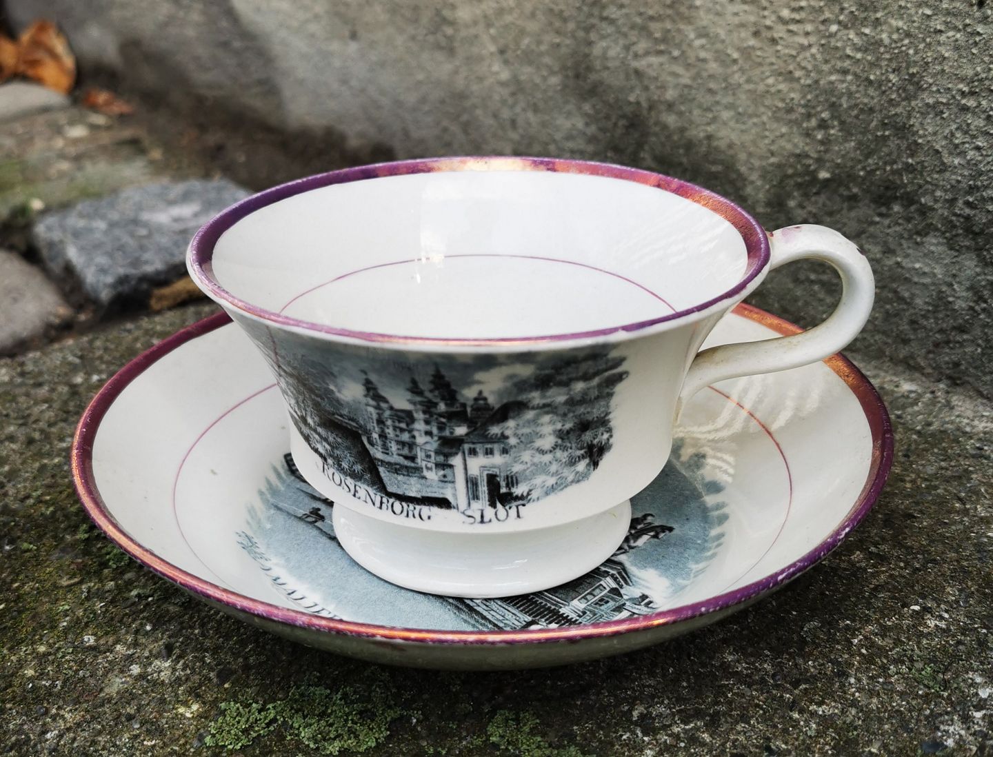 Meget stor morgenkop i fajance med københavnske motiver. Rosenborg Slot, Kongens Nytorv samt Amalienborg i bunden af underkoppen. Fremstår i god stand. Fabriksmærket (et indtrykt anker) på bunden. Mål: Koppen er 7 cm høj og åbningens diameter er 12-12½ cm. Underkoppen er 4 cm høj og har åbningsdiameter på 18½ cm.
