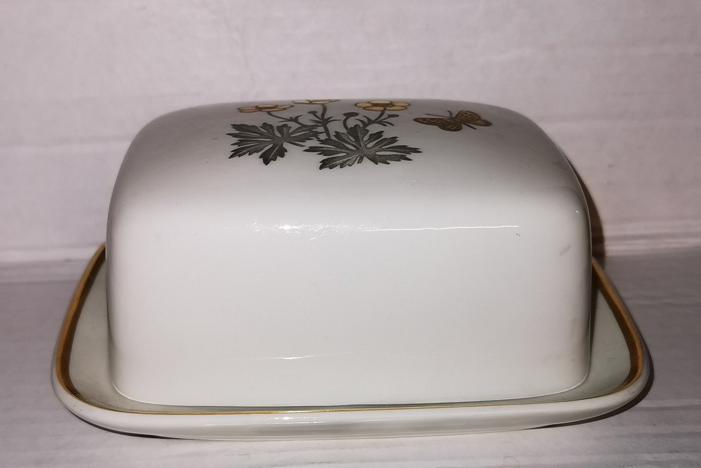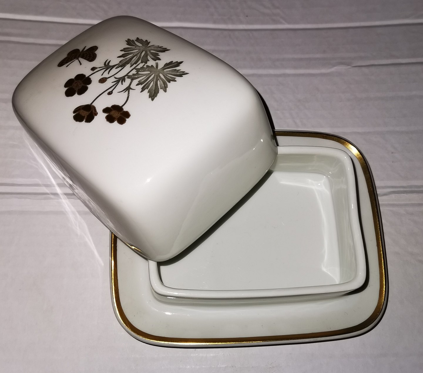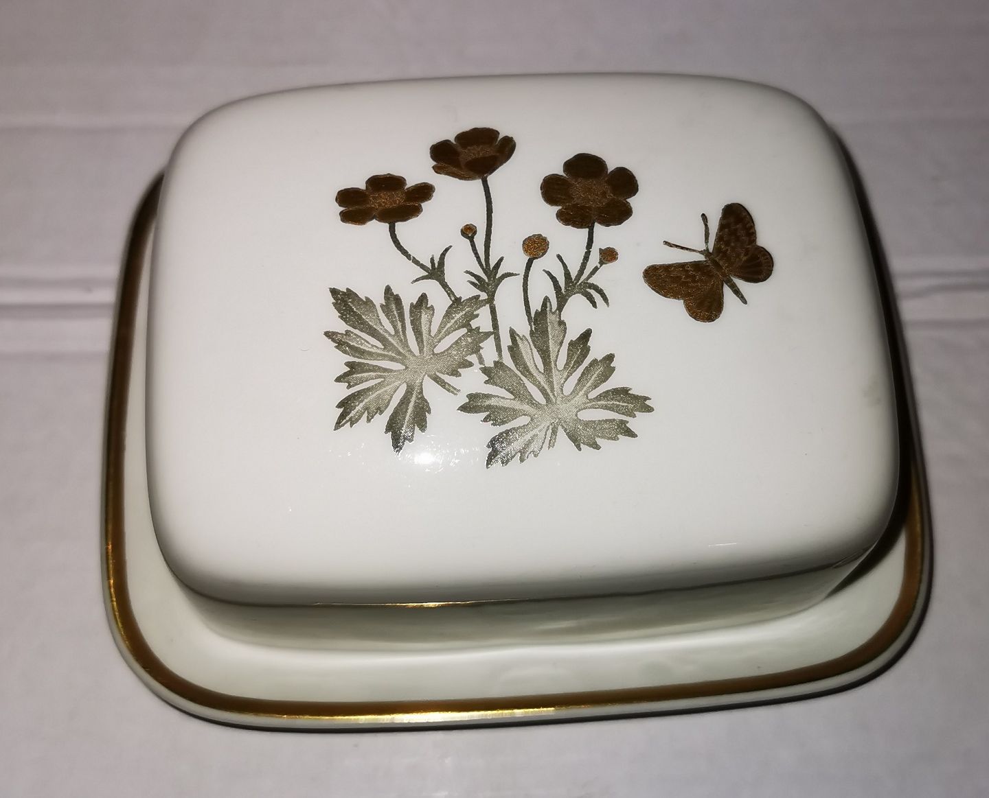 Royal Copenhagen smørskål med sommerfugl og blomster i guld