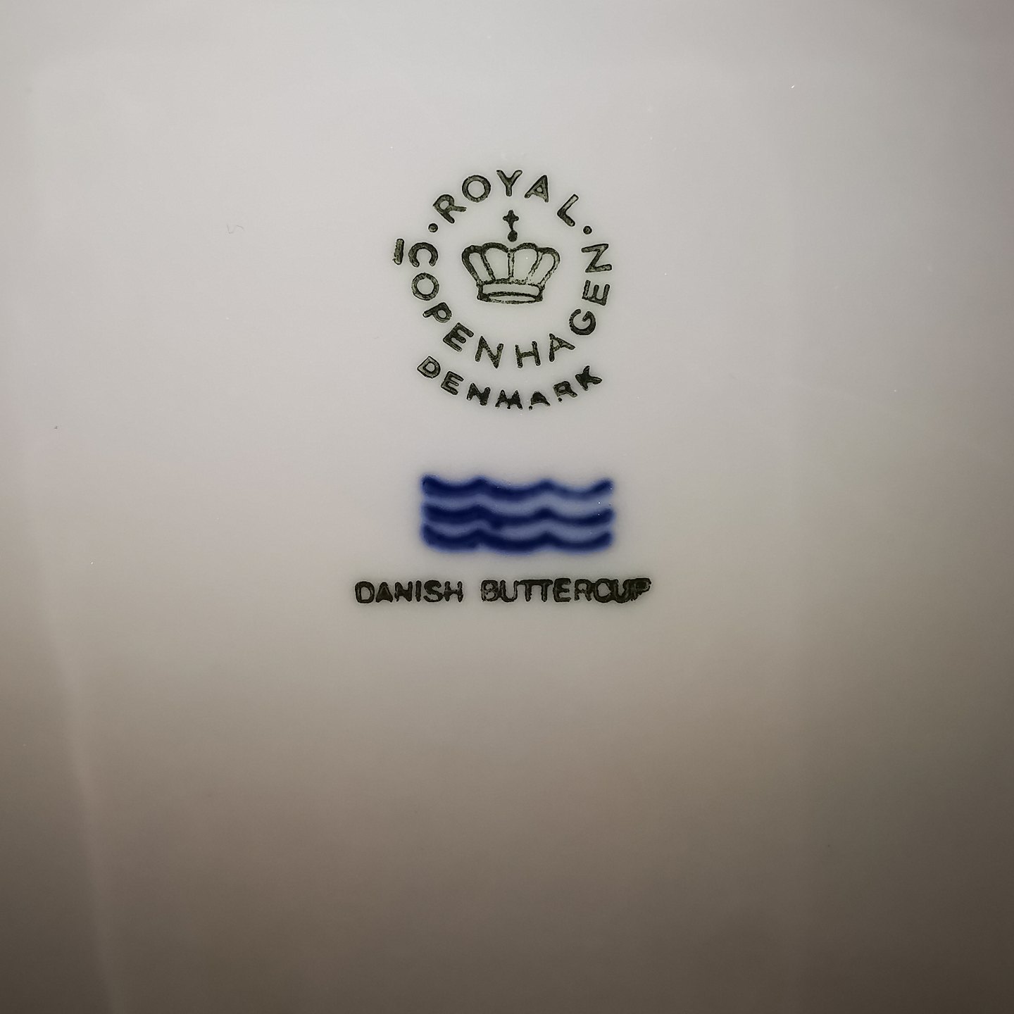Royal Copenhagen smørskål i porcelæn. "Danish Buttercup" Dekoreret med blomster og sommerfugl i guld. Fremstår i perfekt stand. 1. sortering. Mål: H. 7 cm (2.75 inches). Underskålen måler 13 x 18 cm (5.11 x 7.08 inches).