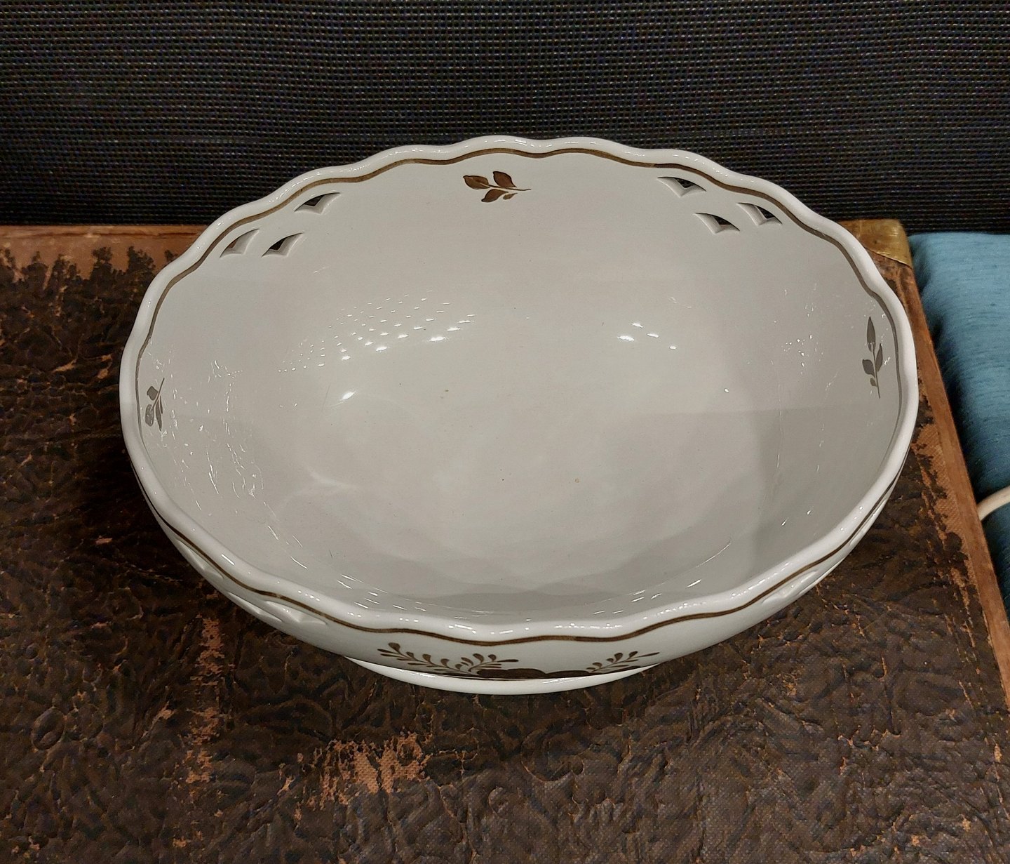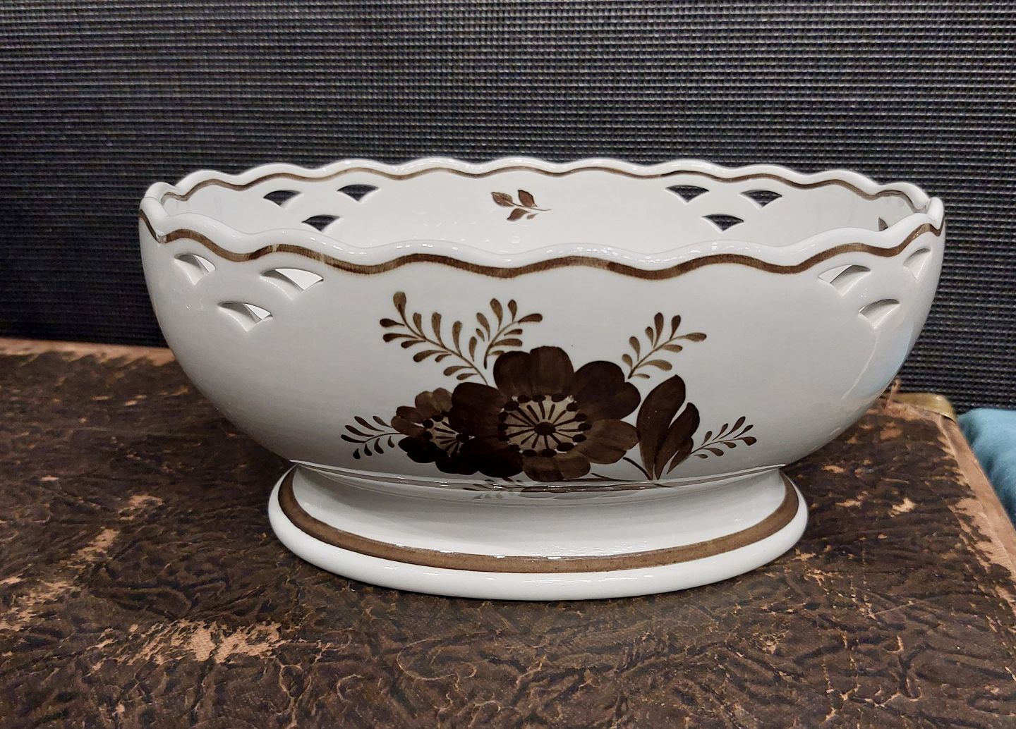 Royal Copenhagen brun Tranquebar fajance skål med gennembrudt dekoration. Fremstår i god stand uden skader eller reparationer. 1. sortering. Modelnummer 45/706. Mål: H. 10½ cm L. 22½ cm B. 18 cm