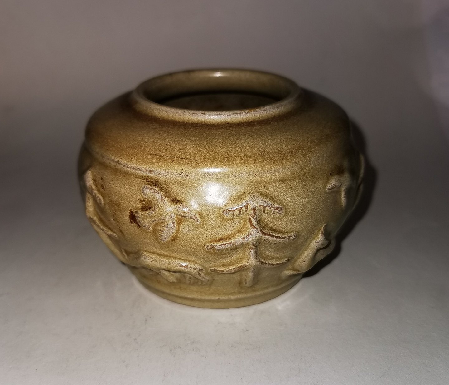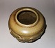 Vase i brun glasur, med springende hjorte i relief, fra den bornholmske fabrik Lauritz Hjorth. I god stand. ingen skader eller reparationer. H. 7 cm
