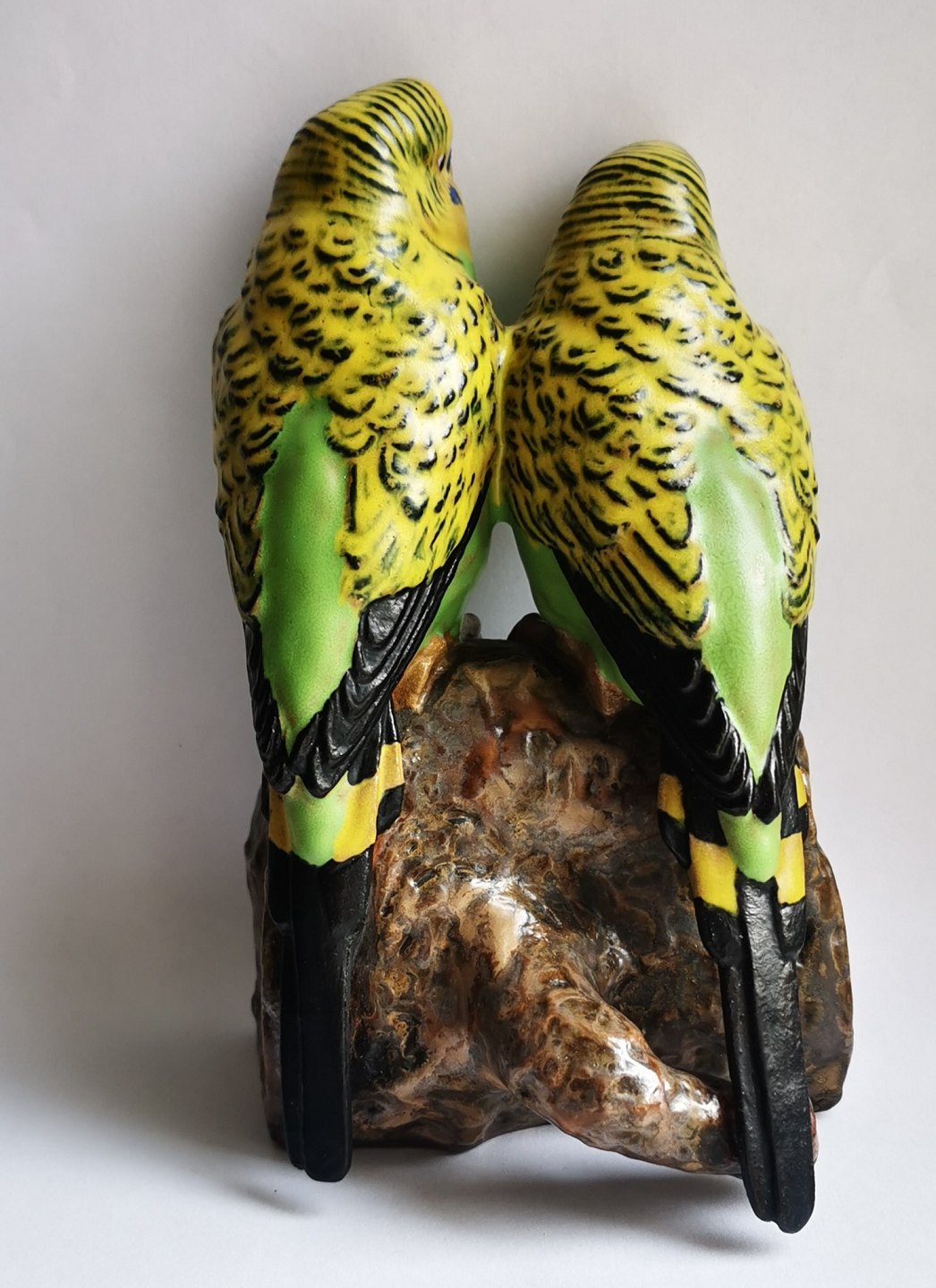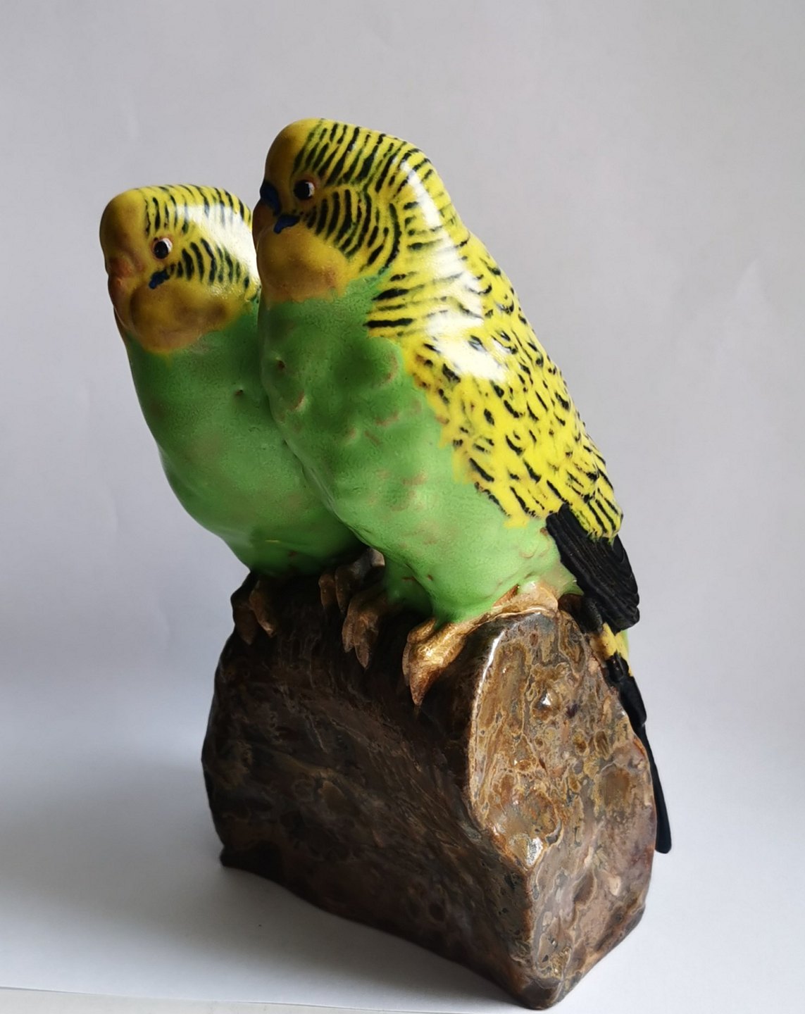 Jeanne Grut: Aluminia figur. Par grønne undulater