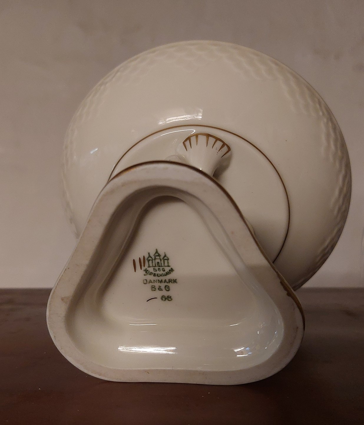 Bing & Grøndahl Heimdal opsats på fod i porcelæn. Fremstår i god stand. 1. sortering. Ingen skader eller reparationer. Fabriksmærket på bunden med B&G samt logo og modelnummer 66. Mål: 10 cm høj (3.93 inches) samt skålens diameter på 14 cm (5.51 inches).