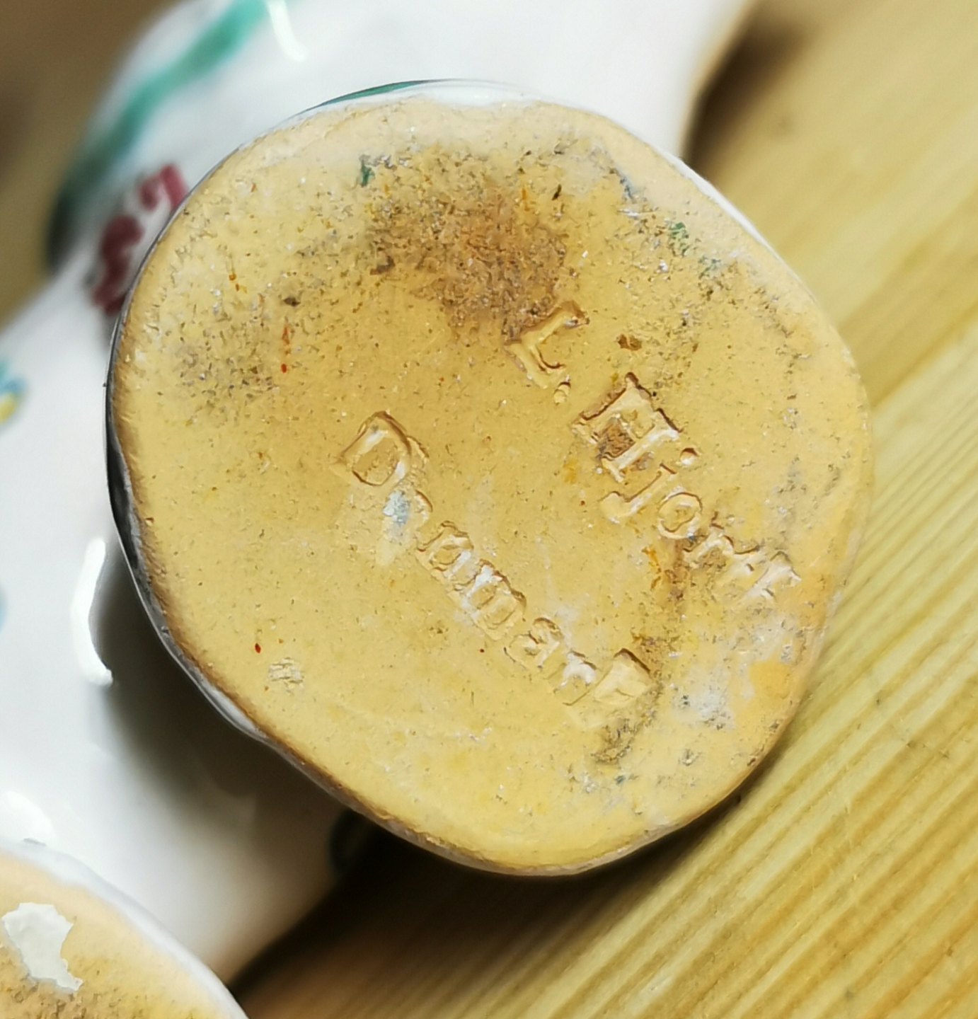 Figur i keramik af elefant fra Lauritz Hjorth, Bornholm. Bemalet med blomster. Har skår på undersiden (se foto). Fabriksmærket på undersiden. Mål: H. 7½ cm L. 9½ cm.