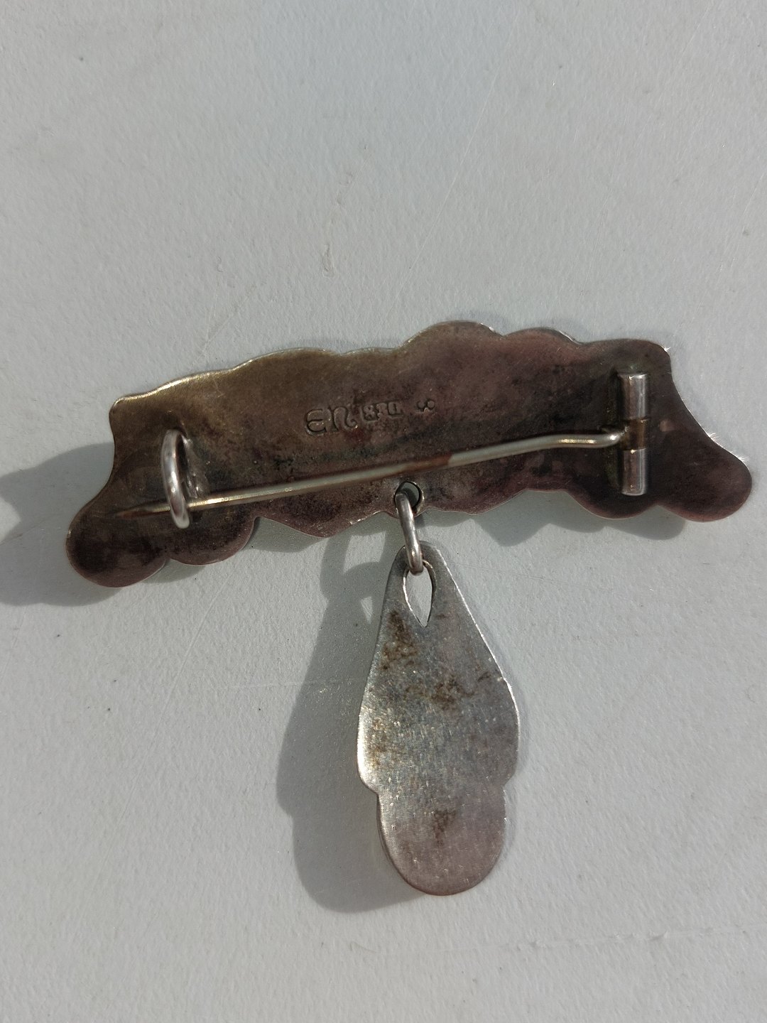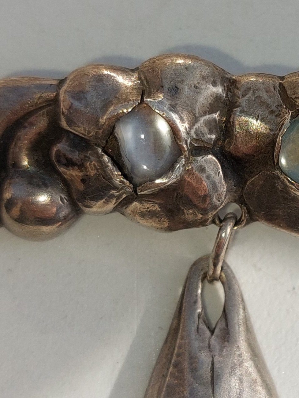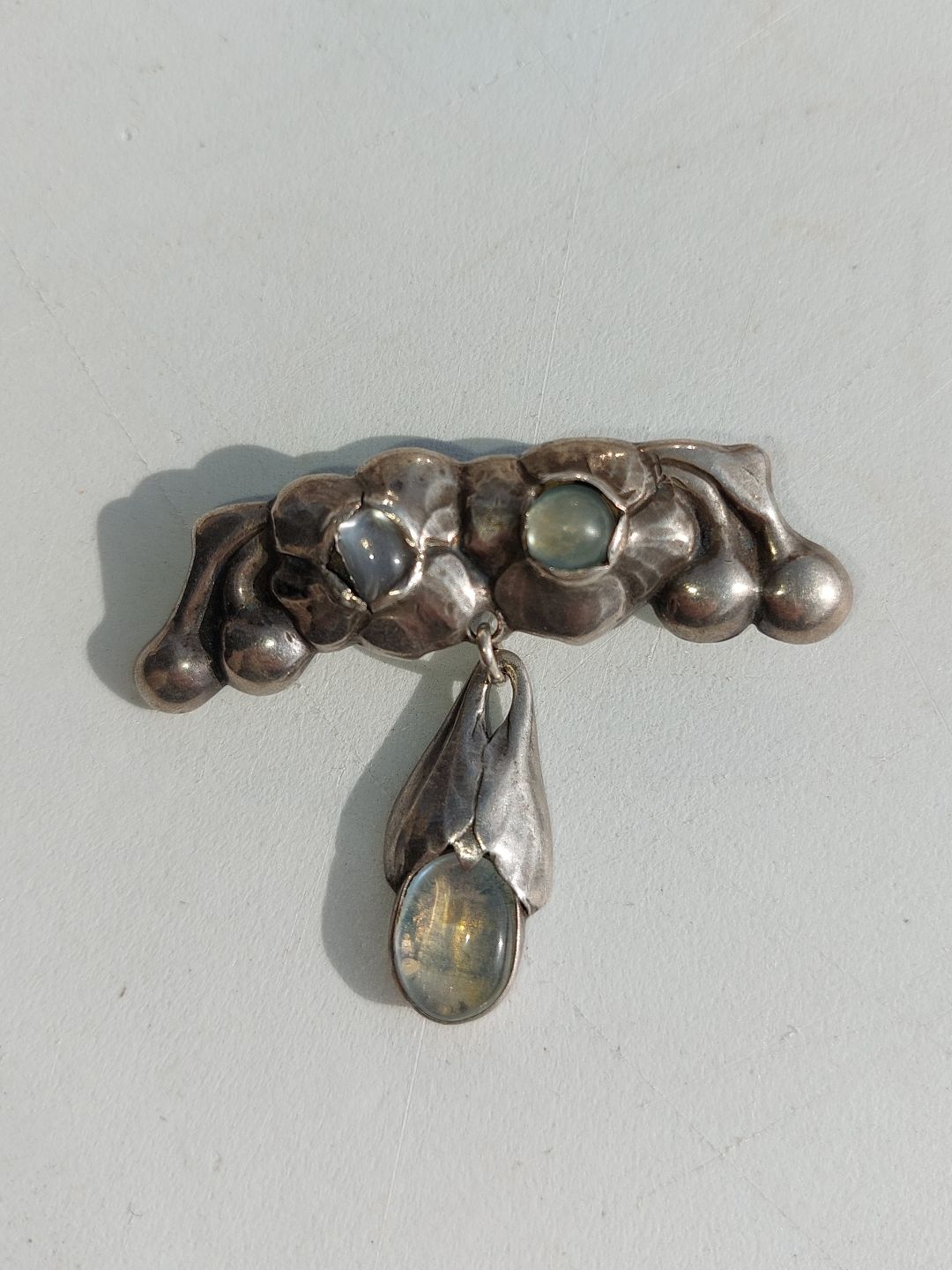 Evald Nielsen broche I sølv månesten. Stenen.til venstre med defekt. 5 cm bred. Stemplet på bagsiden