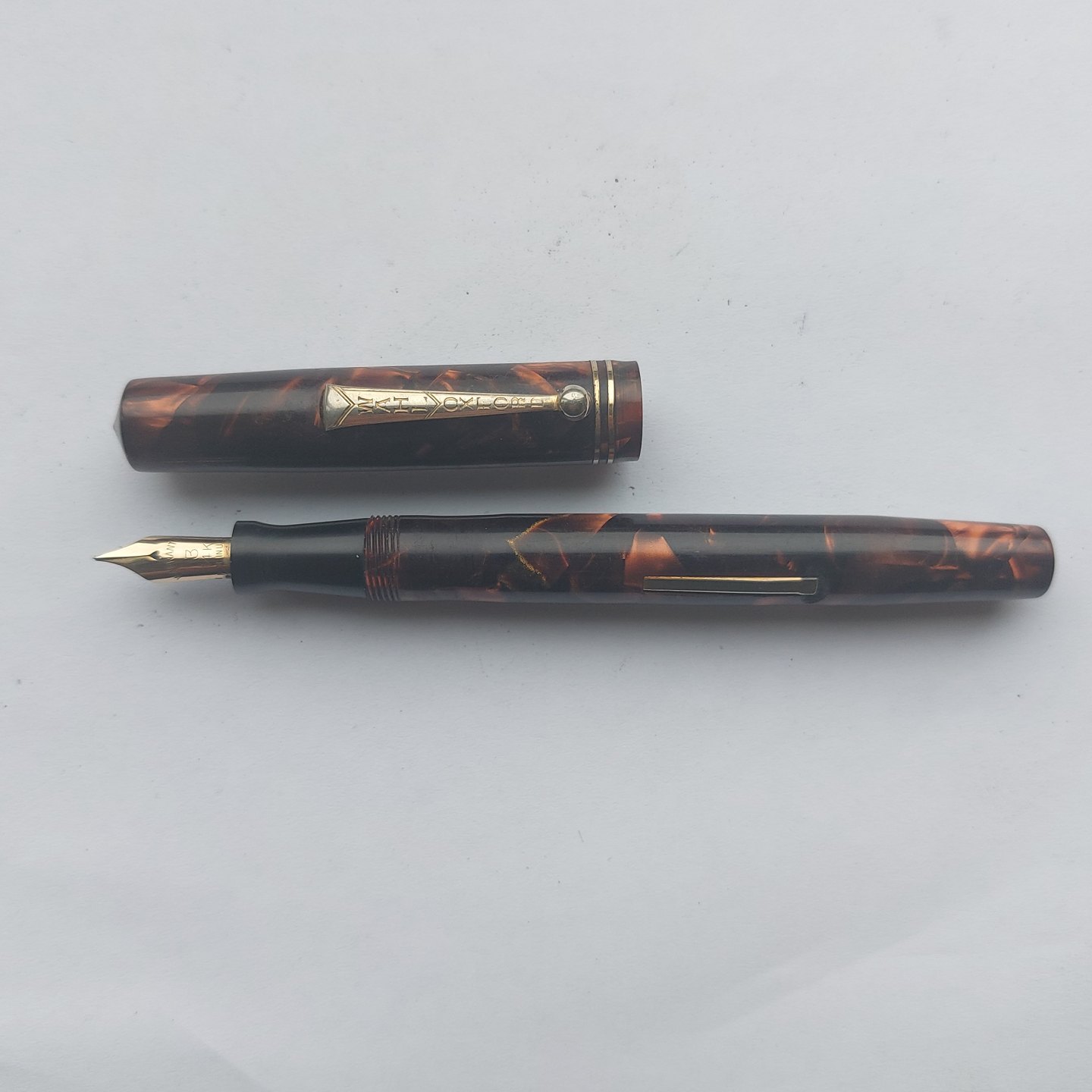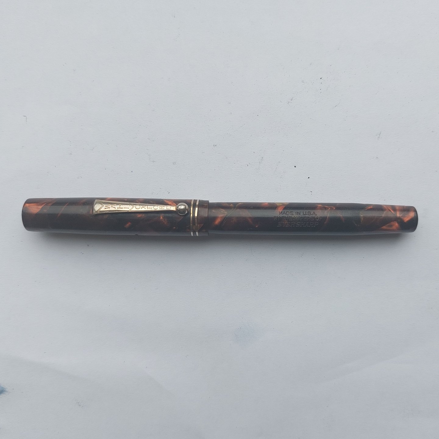 Eversharp produkt: Marmoreret Wahl Oxford fyldepen med leverfiller. Fremstår i god stand. Tekst på kroppen: Made in U.S.A by the maker of EVERSHARP. Ingen skader eller reparationer. 14 karat guldspids. Fungerer ikke. Der skal indsættes ny gummisæt før end fyldepennen skriver igen.
