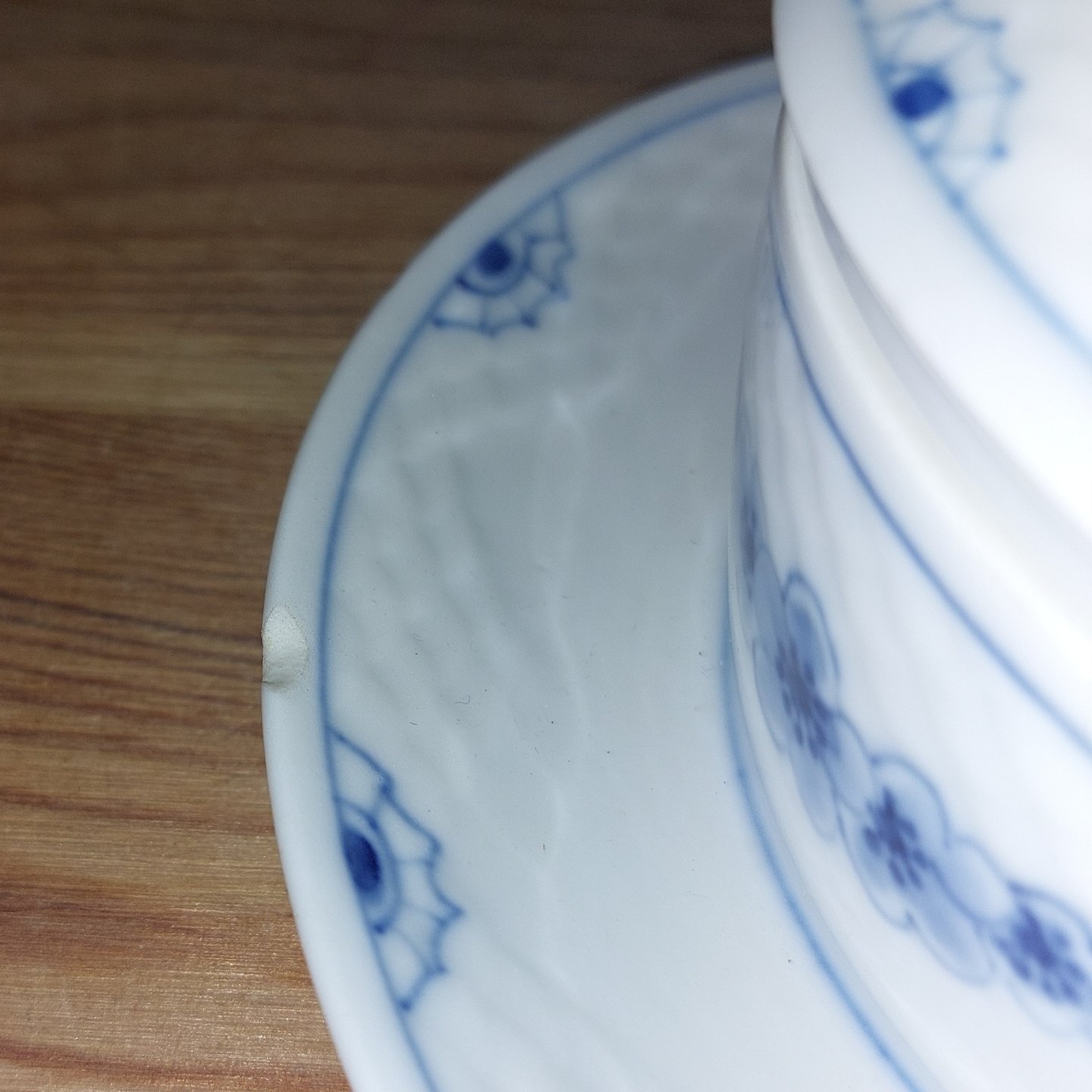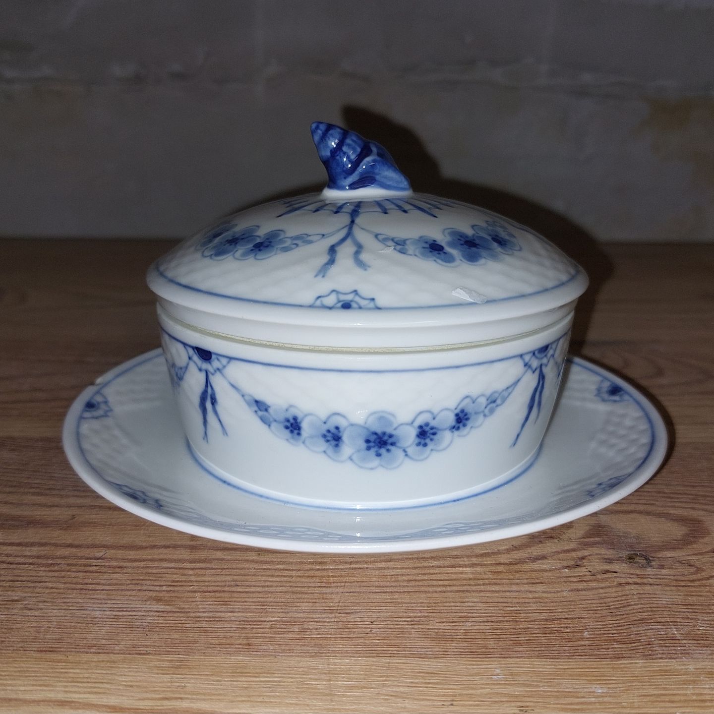 Smørskål i porcelæn fra Bing & Grøndahl fra Empire stellet. 1. Sortering. Har desværre et skår (se fotos). Ellers I orden. Fabriksmærket på bunden/ undersiden. Modelnummer 196. Mål: H. 10 cm Ø. 17 cm