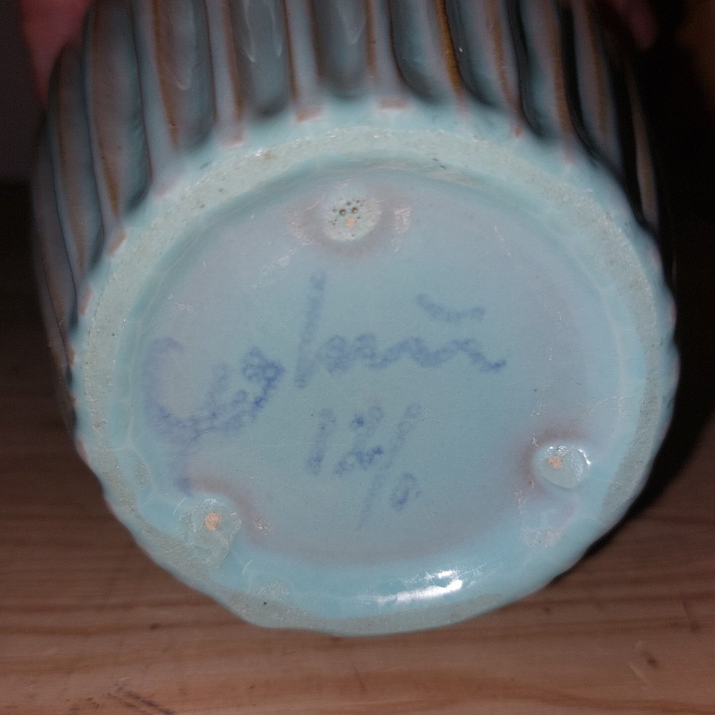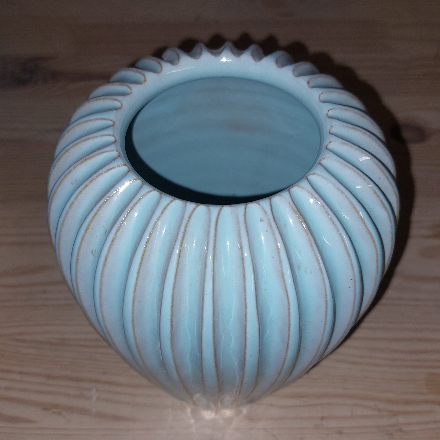 Turkis vase I keramik med den klassisk ribbede dekoration rundt om vase fra Eslau keramikfabrik, Danmark. I god stand uden skader eller reparationer. Fabriksmærket på bunden. 15.cm.