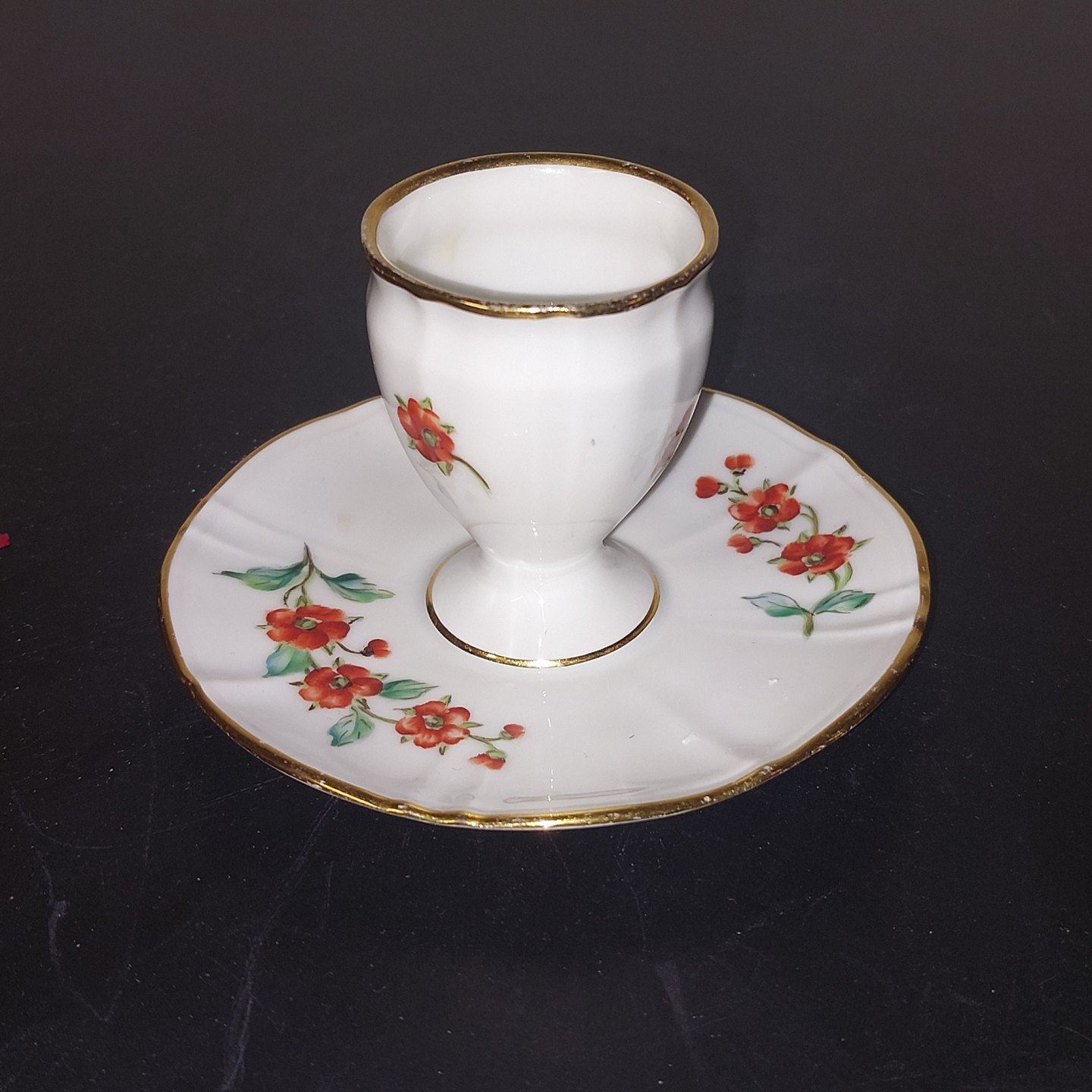 Æggebæger i porcelæn med underskål fra Bing & Grøndahl. Bemalet med blomster. Fremstår I god stand uden skader eller reparationer. Fabriksmærketpåbundensammenmed. Modelnummer 695. Mål: H. 7 cm