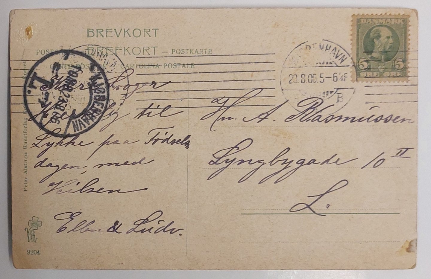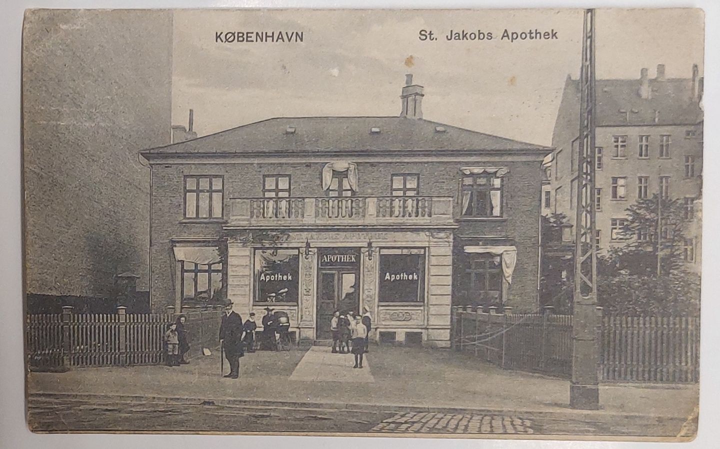 Postkort: Motiv med liv foran Sct. Jakobs Apotek. Annulleret KØBENHAVN I 1906. Brugsspor I hjørnerne.