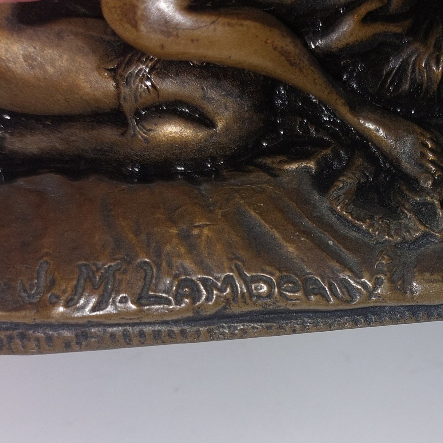 J. M. Lambeaux: Tung bronze patineret figur af to elskende kvinder. I god stand. God stand uden skader eller reparationer. Signeret af kunstneren på den ene side af soklen. Vejer 1100 gram. H. 7,3 cm L. 11,5 cm.