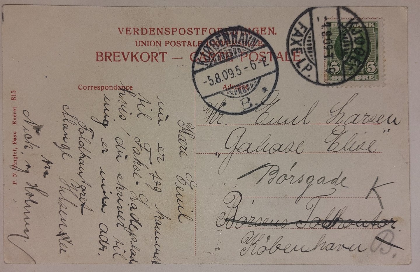 Postkort: Motiv med bl.a. kirketårnet i Faxe Ladeplads. Annulleret KJØGE FAXELP. i 1909. P. N. Tinglef, Faxe Eneret 815.