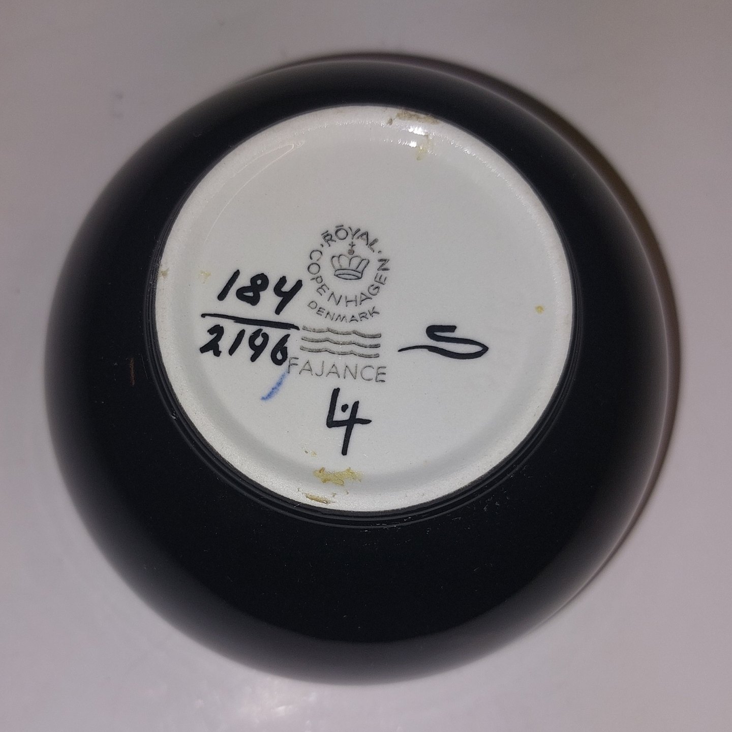 Skål i fajance fra Royal Copenhagen. Farverig dekoration indvendigt sort på ydersiden. Designet af Inge-Lise Kofoed. 1. sortering. I god stand uden skader eller reparationer. Fabriksmærket på bunden. Modelnummer 184 / 2186