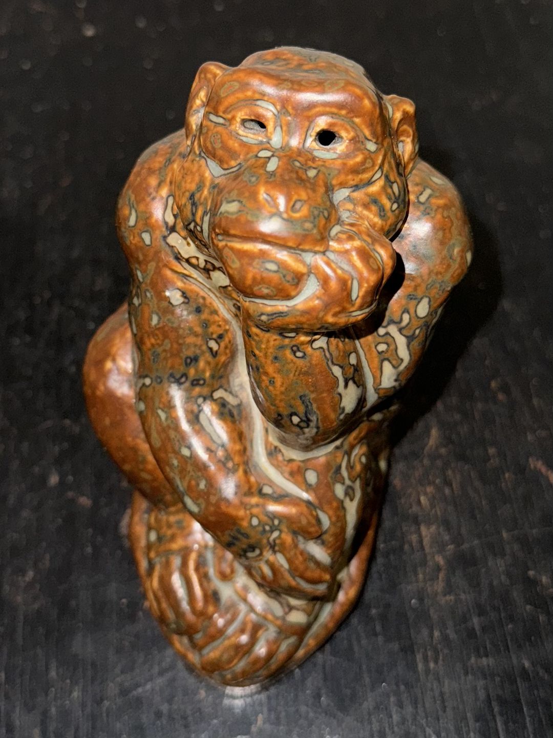 Royal Copenhagen figur i stentøj af siddende abe af Knud Kyhn. I god stand. Fabriksmærket på bunden sammen med produktionsår 1950 samt kunstnersignatur KK. 1. sortering. H. 14,5 cm