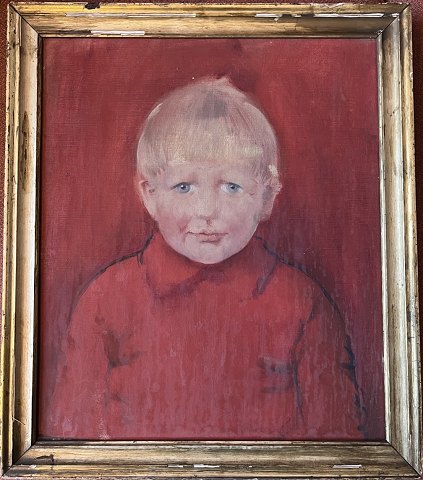 Oliemaleri på lærred af Edvard Saltoft (1883-1939). Portræt af blond dreng i rød trøje. Formodes malet omkring 1920. Ramme og lærred i god stand. Mål: