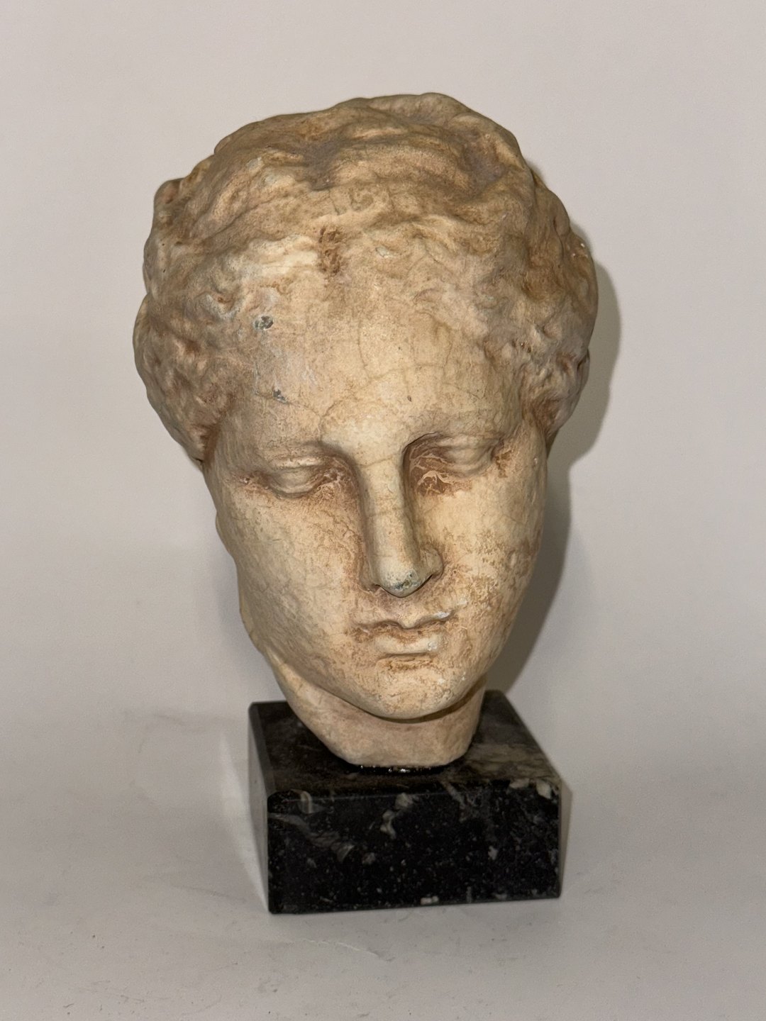 Skulptur i gips på sort sokkel. Forestillende Hygieia, der er den græske gudinde for sundhed, hygiejne og renlighed. Hygieia er datter af guden for medicin Asklepios.