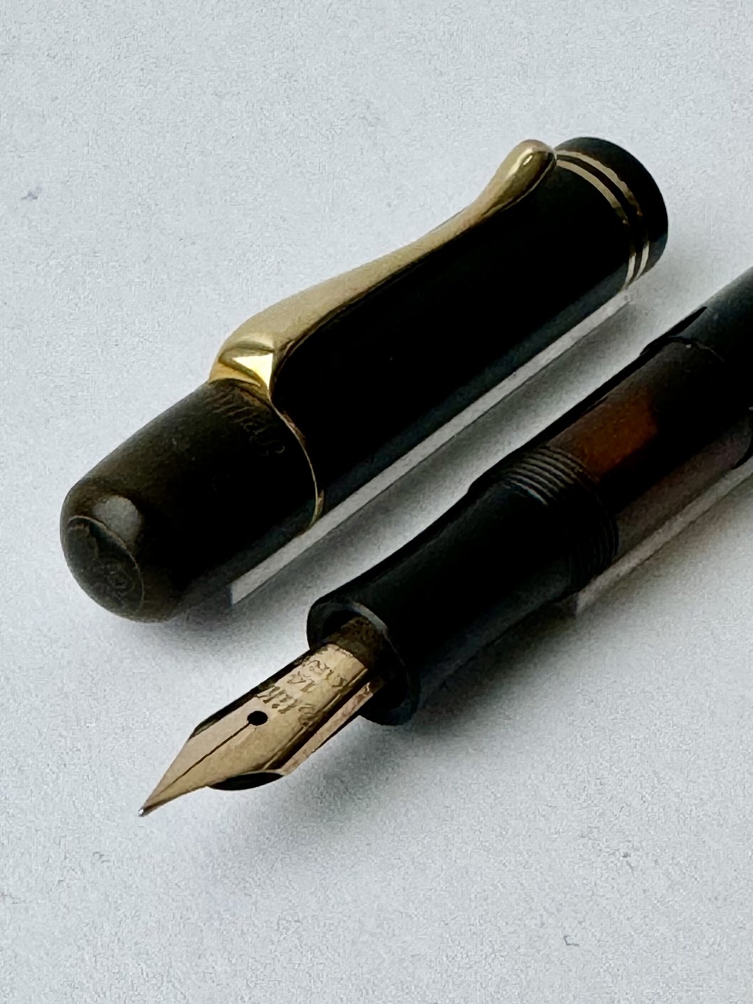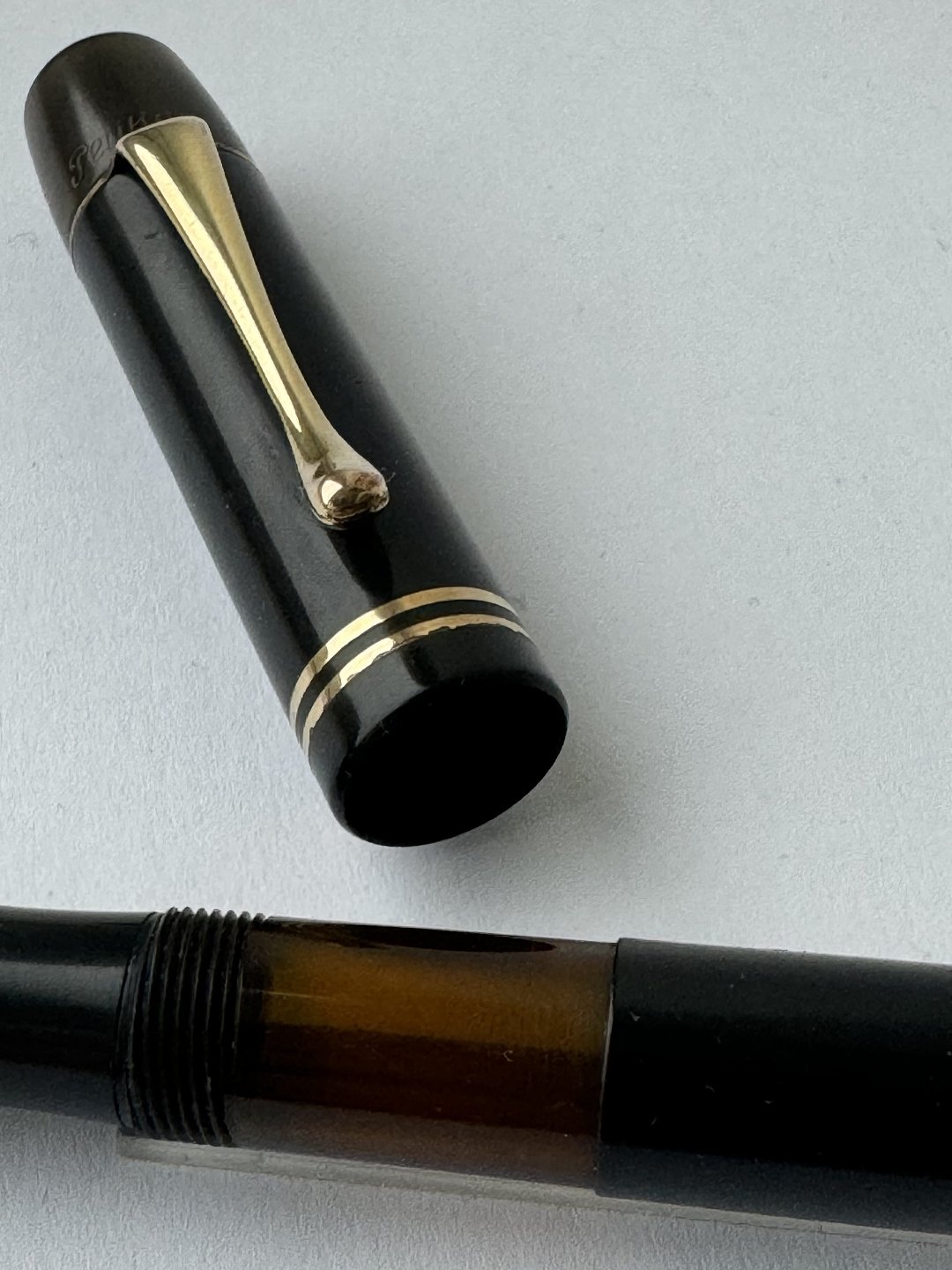 Sort Pelikan 100 fyldepen fremstillet i Tyskland midt i 1930’erne. Piston blækpåfylder. Fremstår i god stand uden skader eller reparationer. Alle dele originale til denne model inklusiv en 14 karat guldspids.