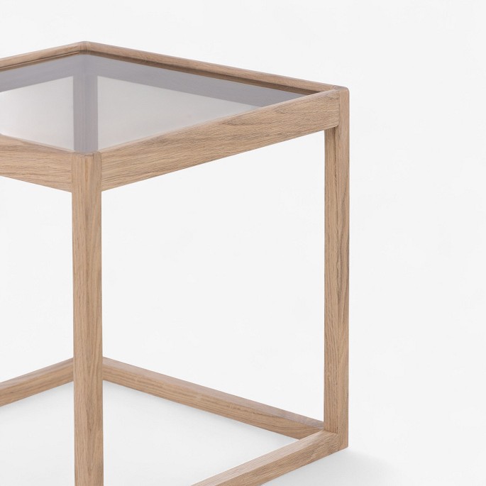 'Kubebord' med stel i lyst egetræ og røgfarvet glasplade.