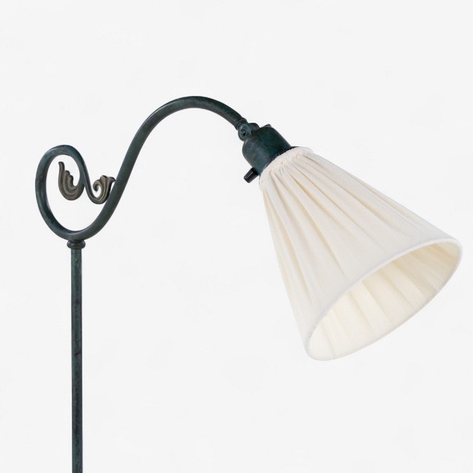 Skulpturel gulvlampe i patineret bronze med højdejustering og hvid stofskærm. Fra 1930.