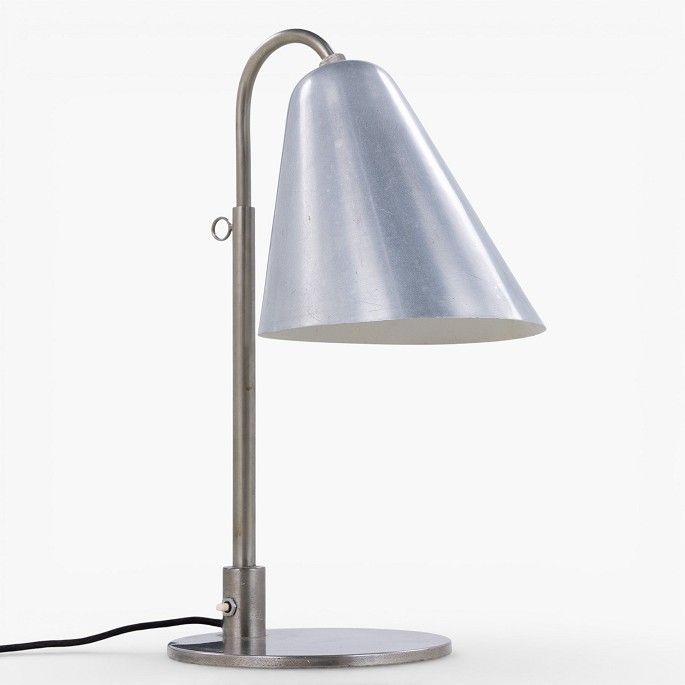 Sjælden bordlampe i forniklet metal med tragtformet skærm. Udført i 1930'erne.