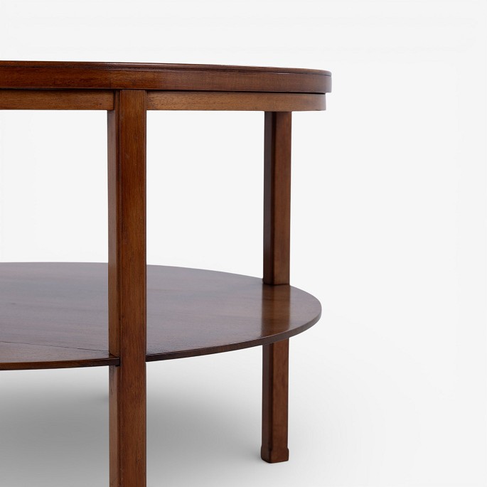 Round coffee table in patinated mahogany with underlying shelf. Manufacturer's mark.