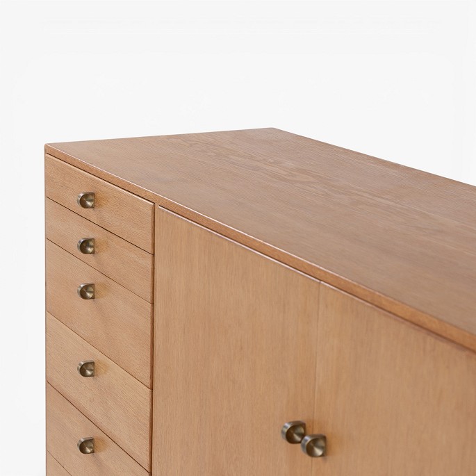 Sideboard in patinated oak with two doors and eight drawers with brass handles. Stamped by manufacturer.