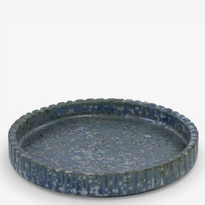 Rundt fad i riflet stentøj med blågrøn glasur. Signeret.
