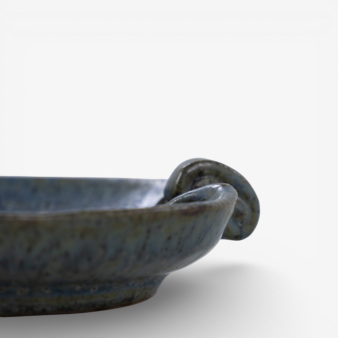 Small stoneware dish with blue-green glaze. Signed.