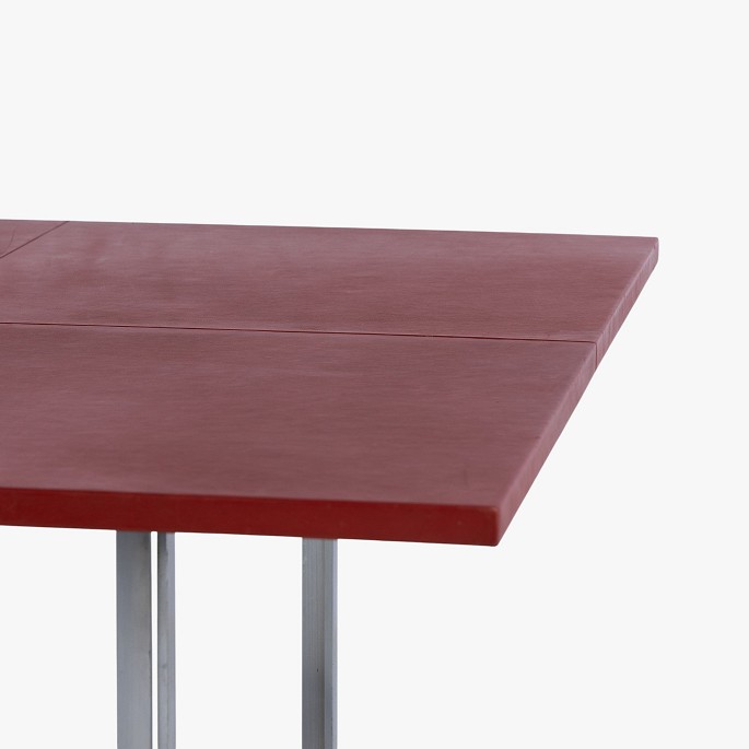 PK 40 - Square dining table with red leather top on steel frame. Manufacturer's mark.