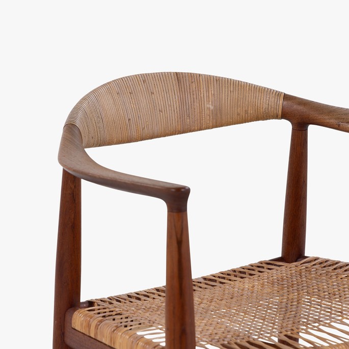 JH 501 - Set of 6 'The Chair' dining chairs in patinated teak with wicker seat and back.