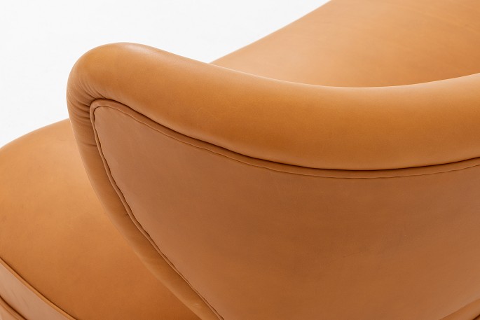 Reupholstered sofa in Shade Coganc leather w. legs in stained beech.