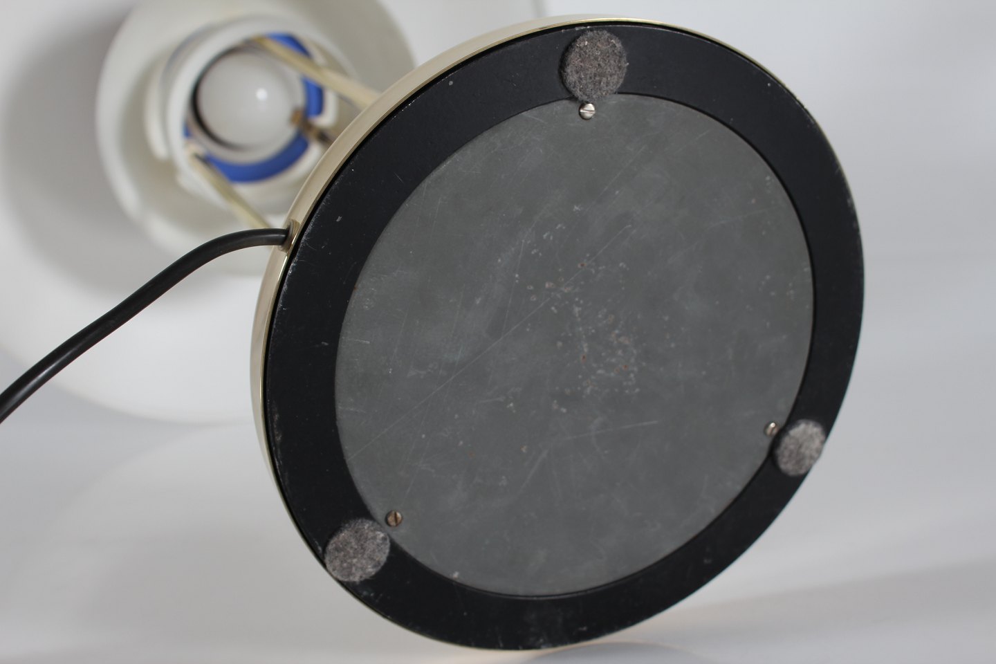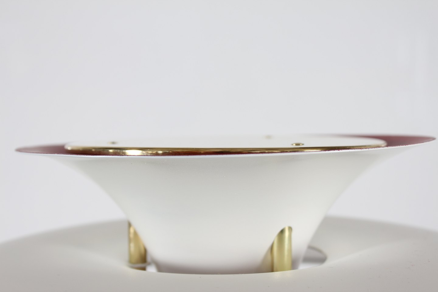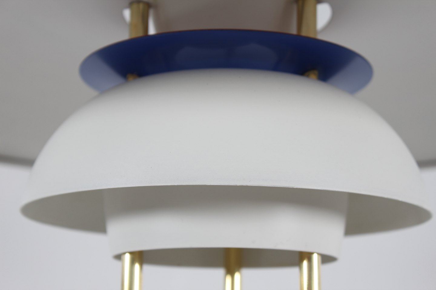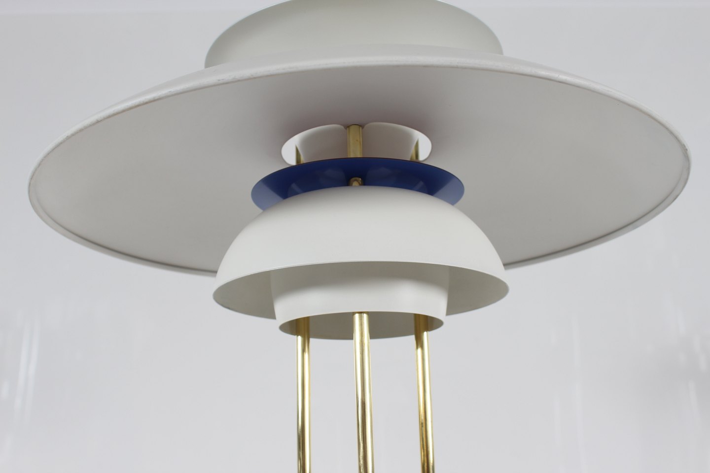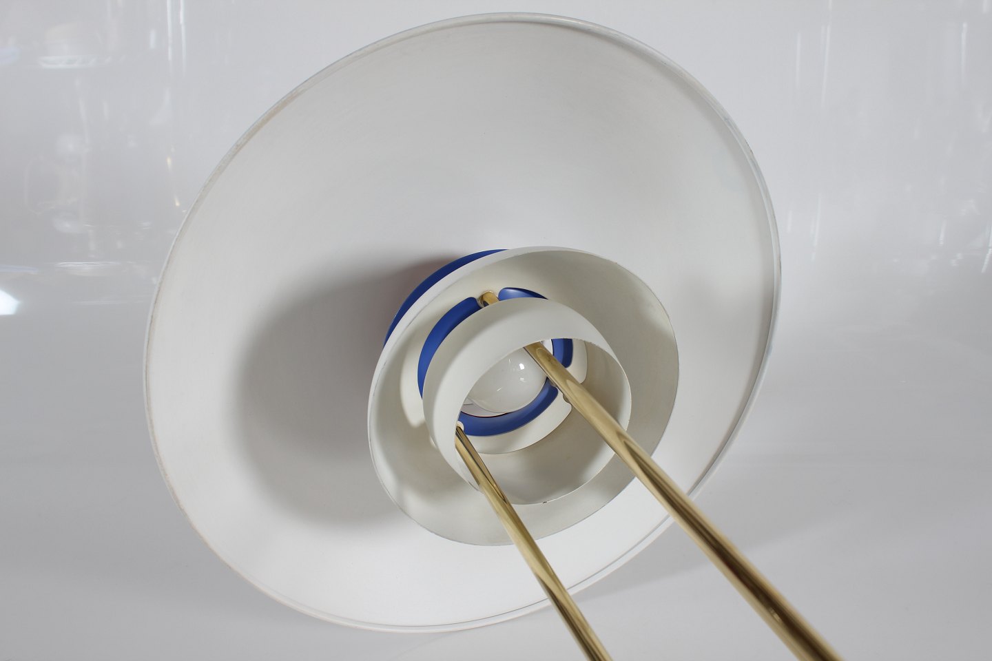 Poul Henningsen (1894-1967) PH 5 bordlampe m/fod af messing og hvidlakerede skærme Højde 62 cm Diameter 45 cm Producent: Louis Poulsen A/S Lampen er i fin stand og fuld funktionsdygtig - med nyere lakering af skærmene