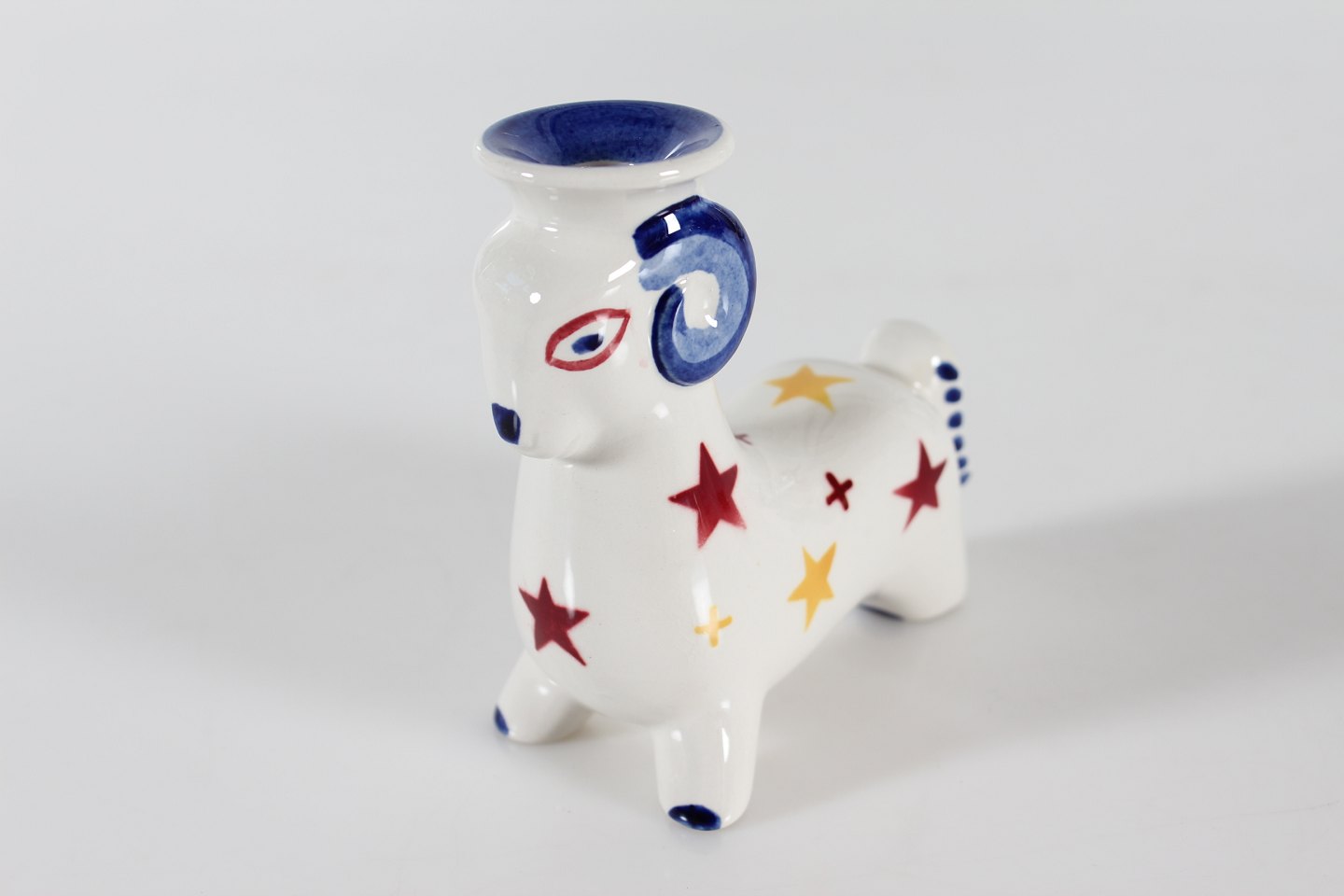 Aluminia Julebuk Julebuk i fajance udformet som lysestage med blå ring tegnet af Kaj Lange til julen 1941 Længde 10 cm Højde 10 cm Fin fejlfri stand, en smule krakelering kan forekomme