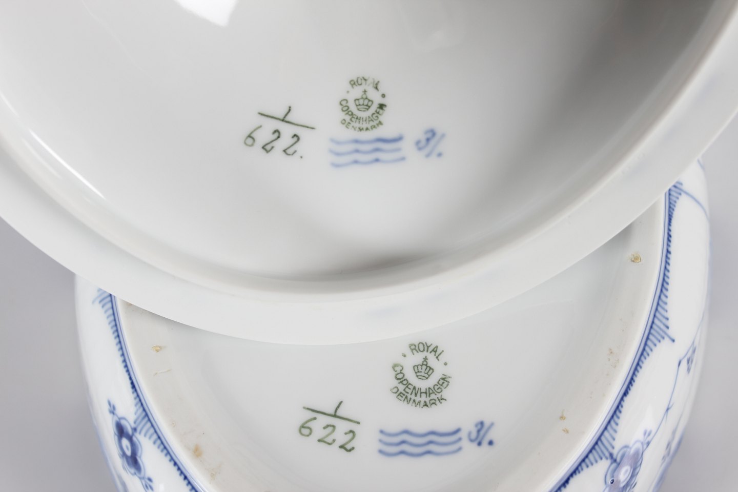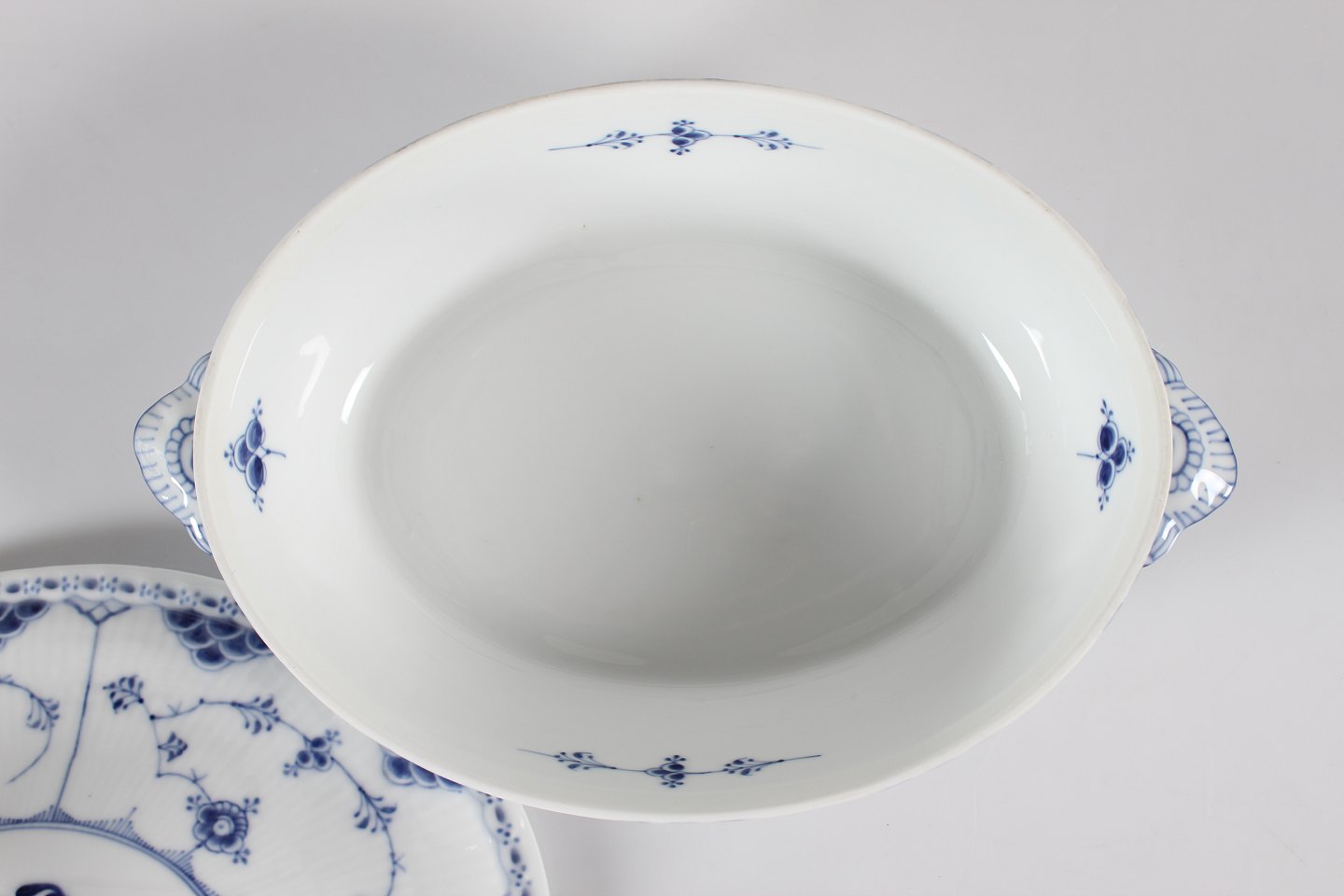 Royal Copenhagen Musselmalet Halvblonde Ovalt lågfad/lille terrin nr. 1/622 Med stempel fra perioden 1923-34 Længde 27,5 cm Bredde 19 cm Højde 15 cm Fin fejlfri 1. sortering