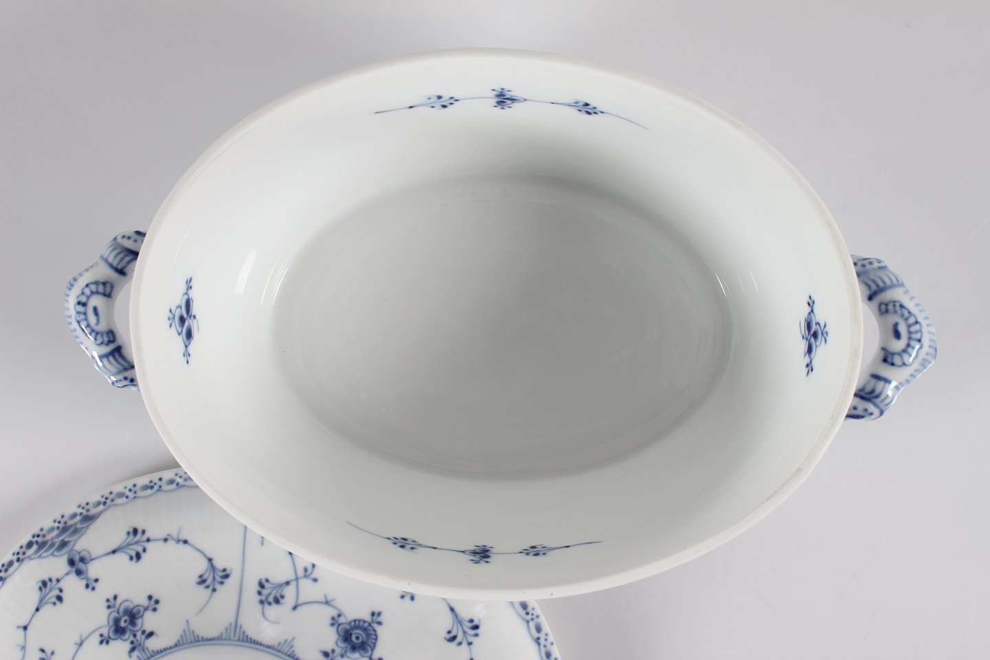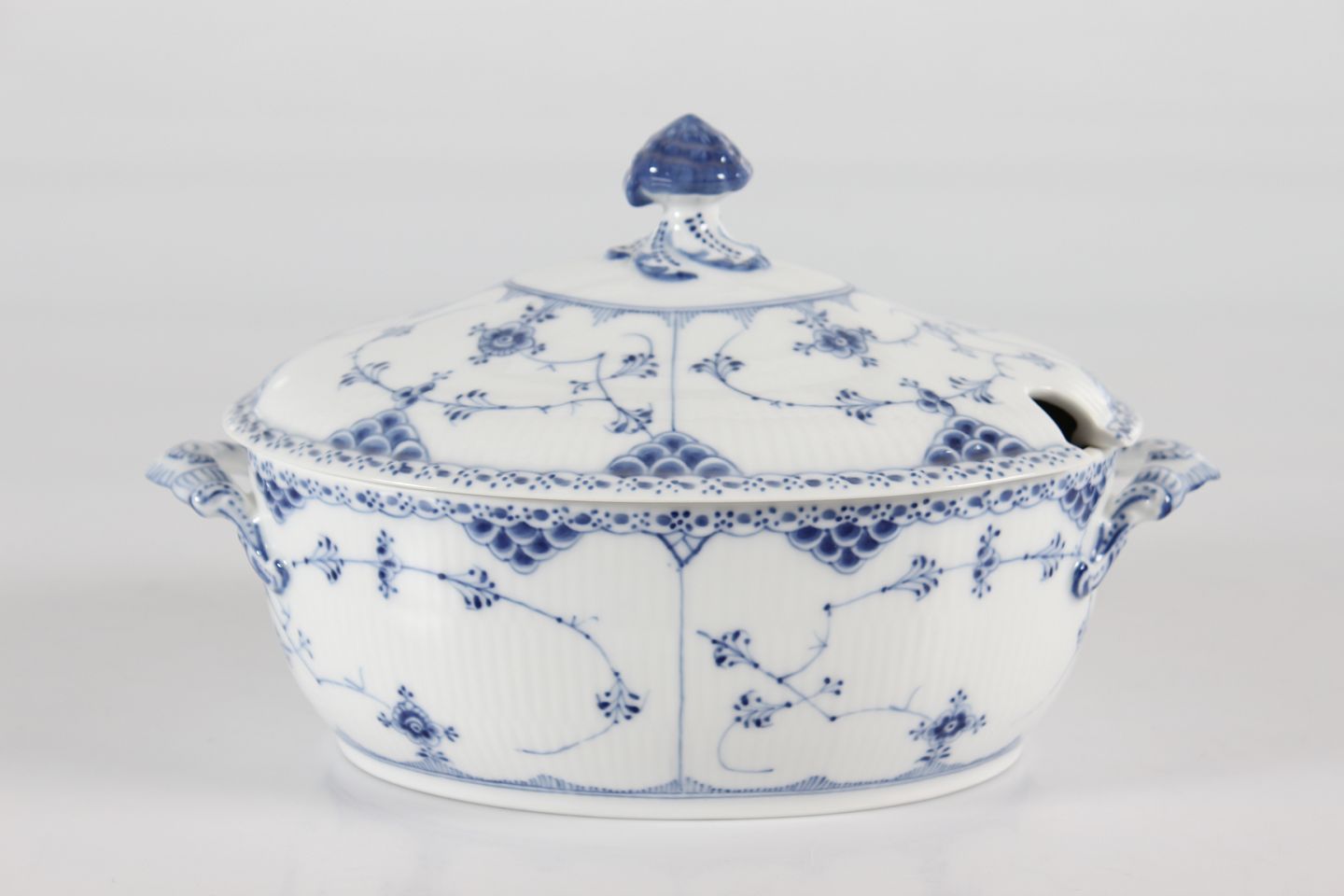 Royal Copenhagen Musselmalet Halvblonde Stor oval terrin nr. 1/595 Med stempel fra perioden 1923-34 Længde 32 cm Bredde 21 cm Højde 20 cm Fejlfri 1.sortering