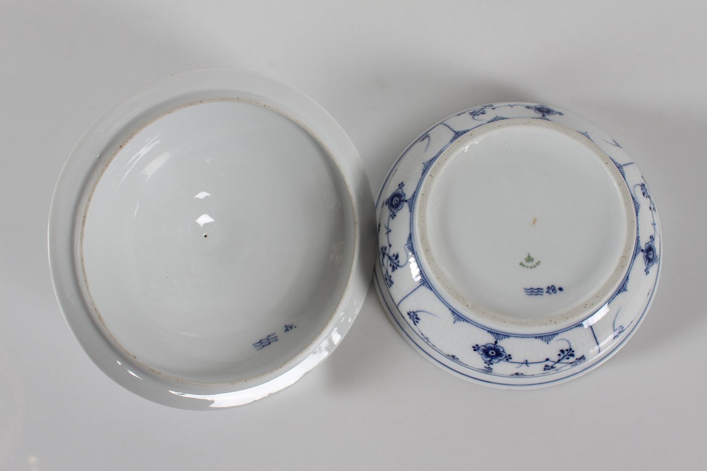 Royal Copenhagen Musselmalet Riflet Antik lågfad med stempel fra perioden 1893-1900 Diameter 23,5 cm Højde 17 cm Fin stand - 1 sortering - se billeder af lille afslag på fadets kant