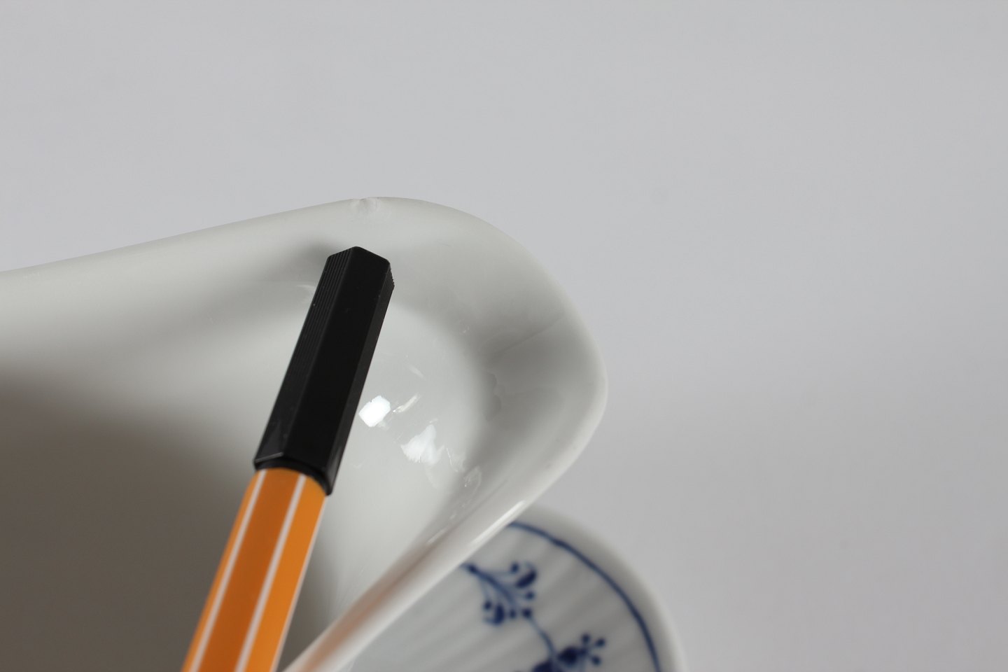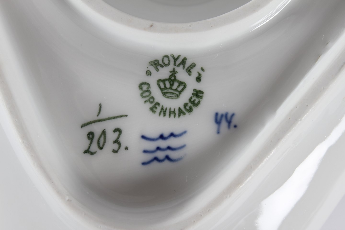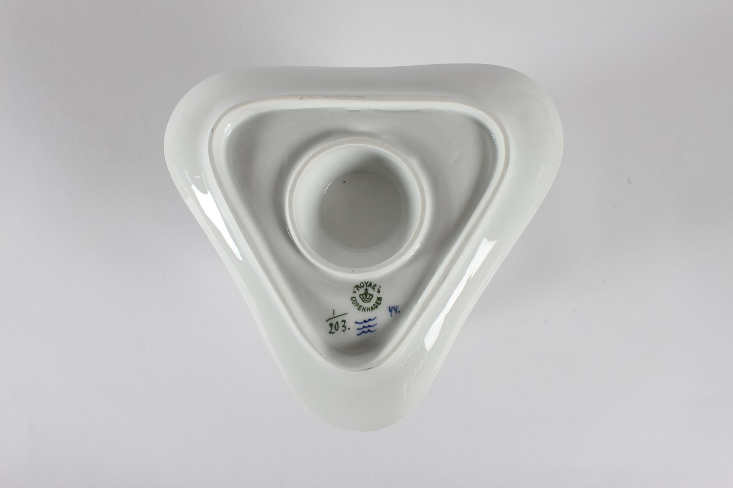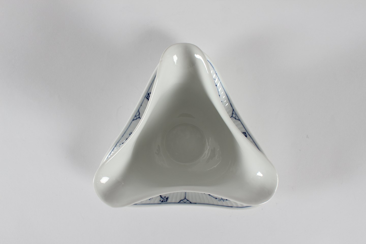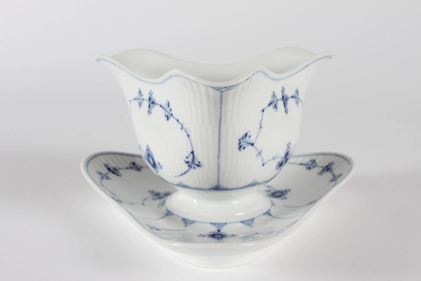 Royal Copenhagen blue fluted plain Triangular sauce boat no. 1/203 With stamp from the period 1894-1922 Length 21 cm Width 21 cm Height 12 cm Factory 1 - see images of three small chips