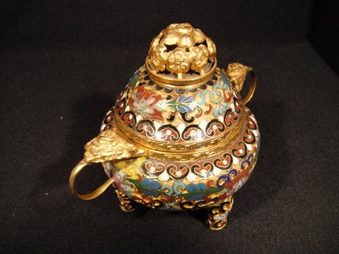 Lille russisk krukke med tre ben. I forgyldt messing. og talrige indlægninger i Emalje