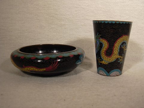Gammel Cloisonné skål og Bæger med drage motiv og indvendig emalje pæn stand