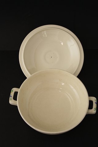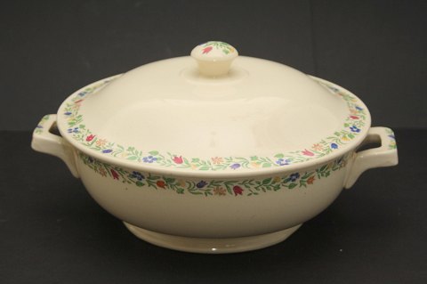 Terrin med låg. Højde 13 cm. Længde 27 cm. Lidt krakerling indvendig. Pris: 300 kr.