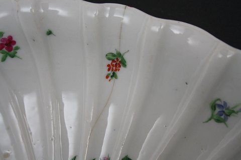 Den Kongelige Porcelænsfabrik, smuk dobbelt porcelænsassiet med hank fra perioden 1830-1845. Håndmalede blomster ovenpå glasuren. Den har lidt brugsslid, samt en hårevne se foto 2. Længde 31 cm. Bredde 25 cm. Højde 12 cm. Pris: SOLGT